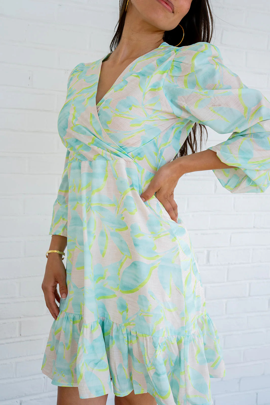 Step into party mode at the coast with Banks Dress. Whether it's a daytime celebration or evening cocktails, this dress has got you covered. Dress it up with heels or keep it chill with sneakers or sandals. Versatile for any event! This playful dress features a fully lined, crossover v neckline and a full length sleeve with an adjustable elastic hem (so you can customize your look). The paneled ruffle hem adds a unique touch to this quirky and fun design. Perfect for any occasion!