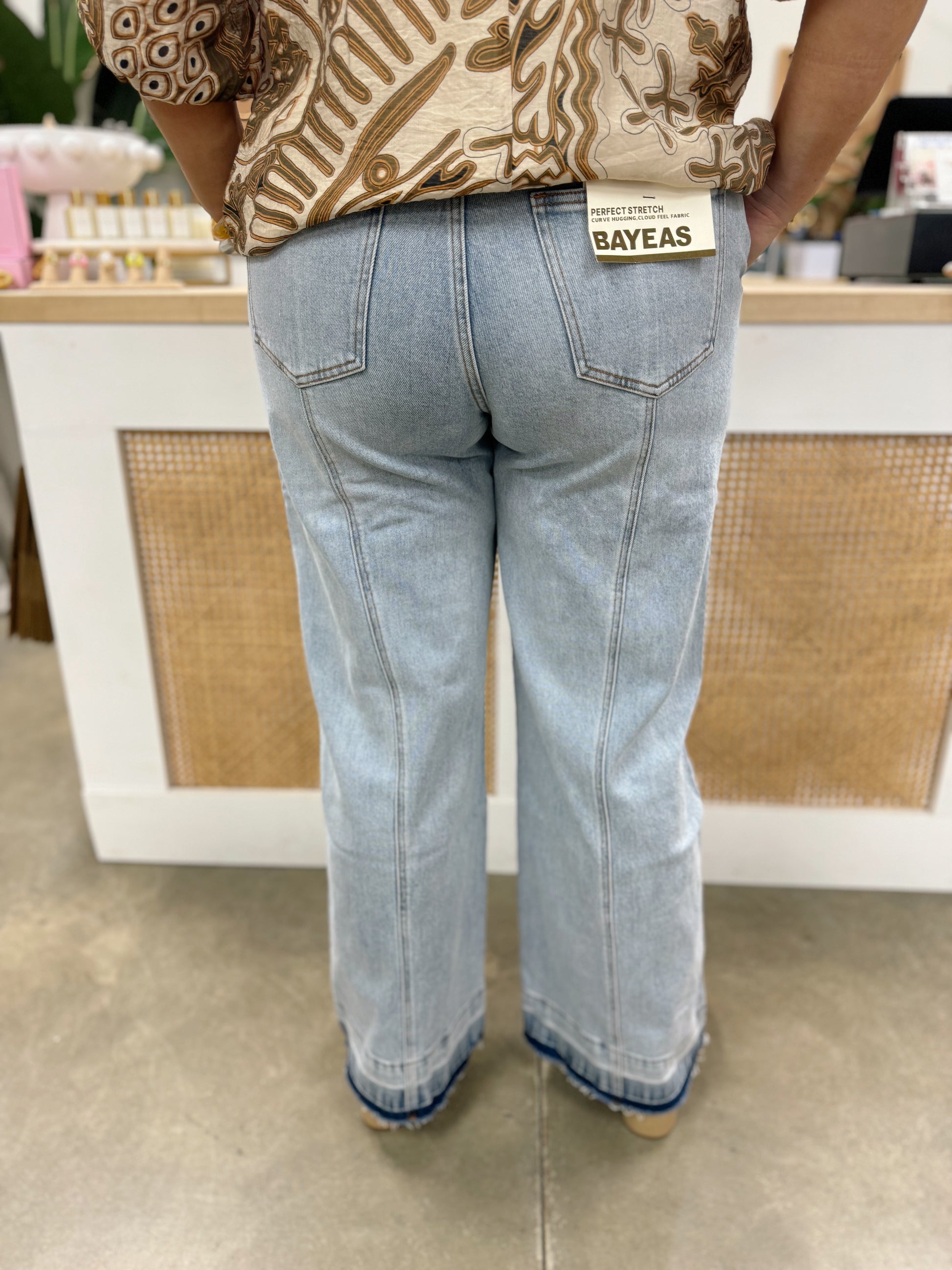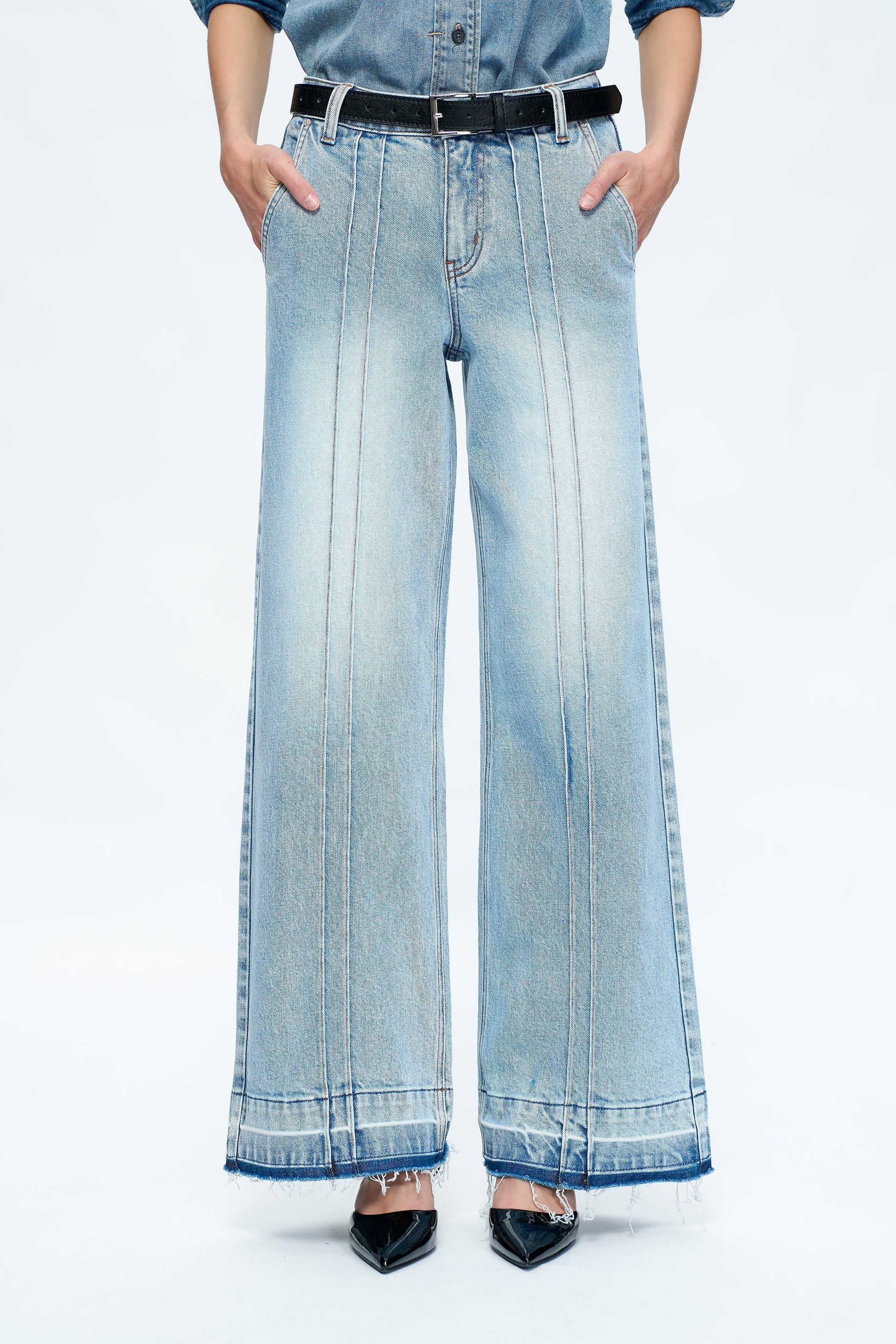 Mid-rise wide-leg jeans crafted from slightly stretchy fabric in a light blue wash. Featuring slant pockets on the front, parallel pleats down the center of the legs, and handcrafted fading details. The hem is accented with contrasting wash marks for a unique finish.
