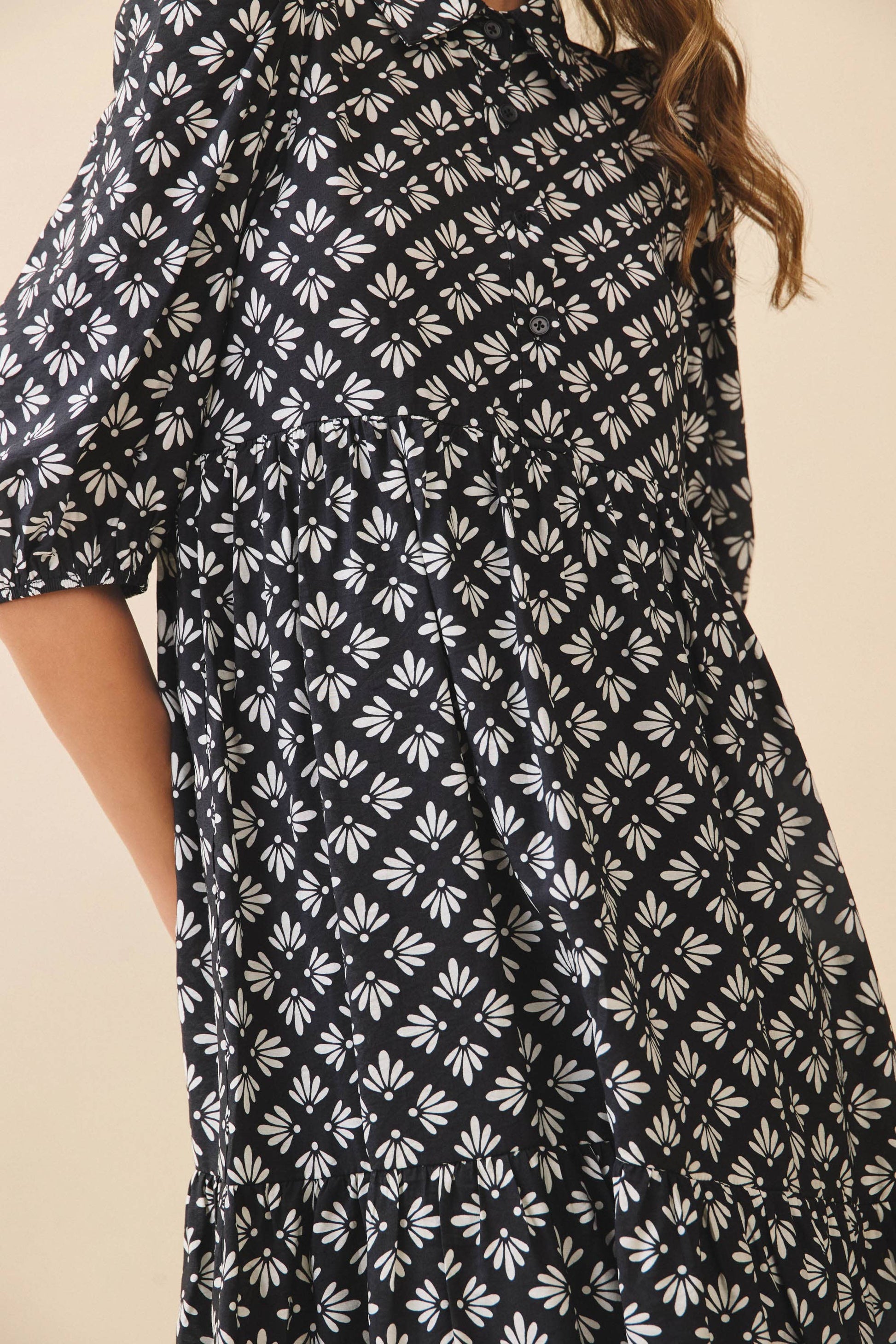 A geometric floral print shirt dress featuring a pointed collar, partial button placket, and puff elbow-length sleeves with gathered cuffs. Designed with a relaxed A-line silhouette and tiered midi-length skirt.