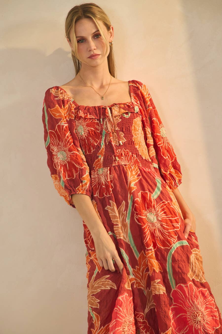 Crinkled floral print midi dress featuring a square neckline with front tie detail, puffed half sleeves, and gathered waist.