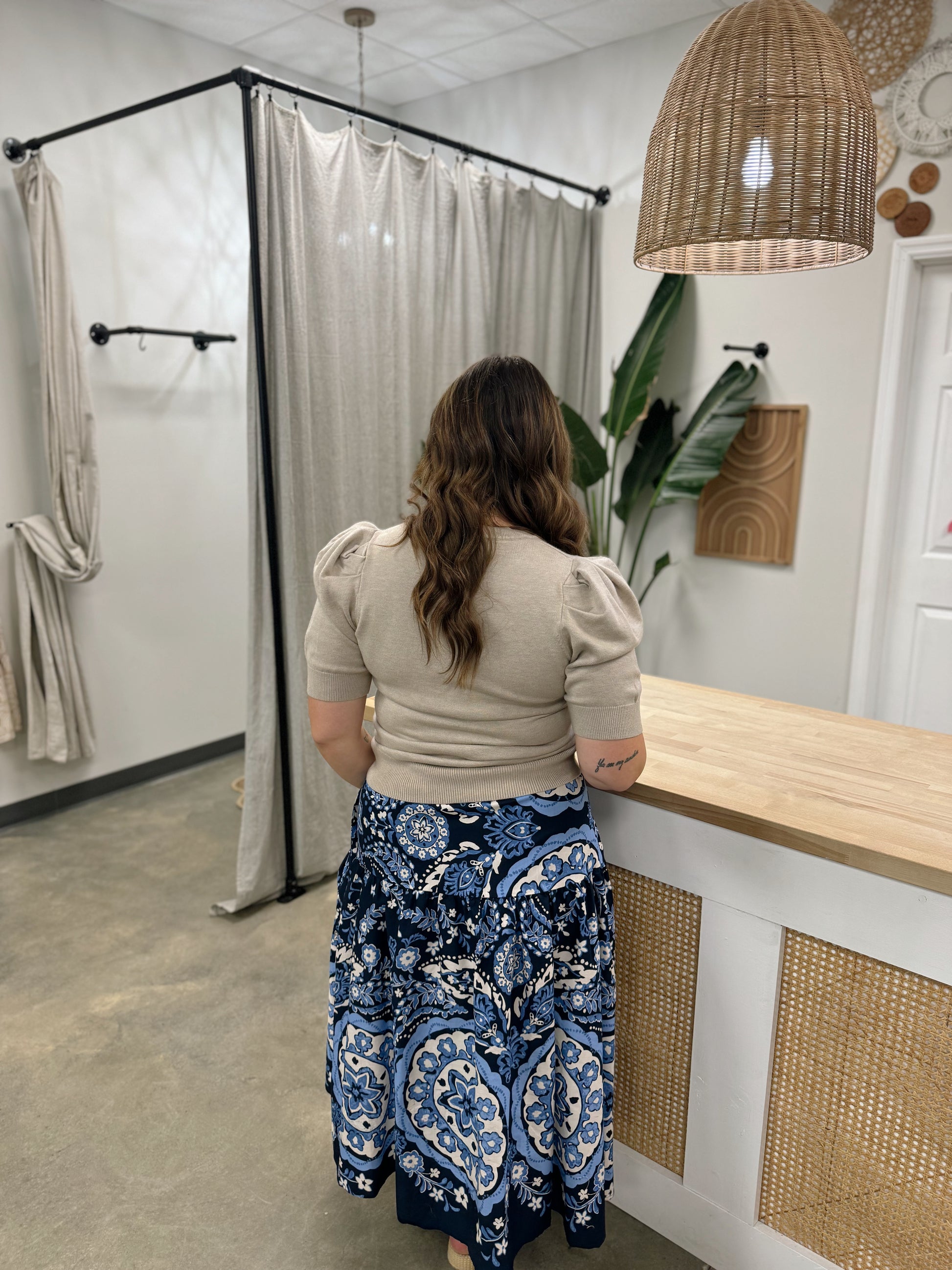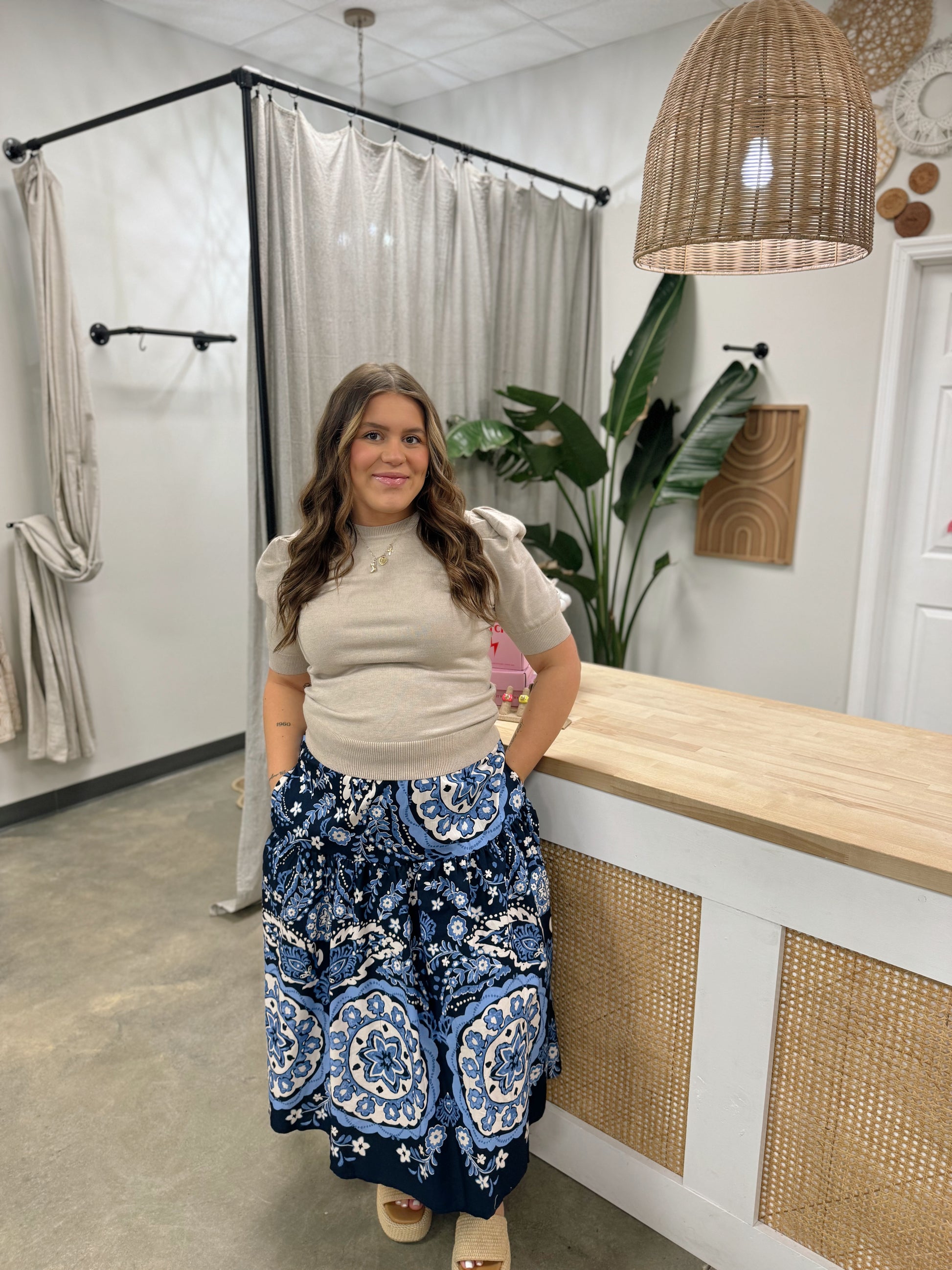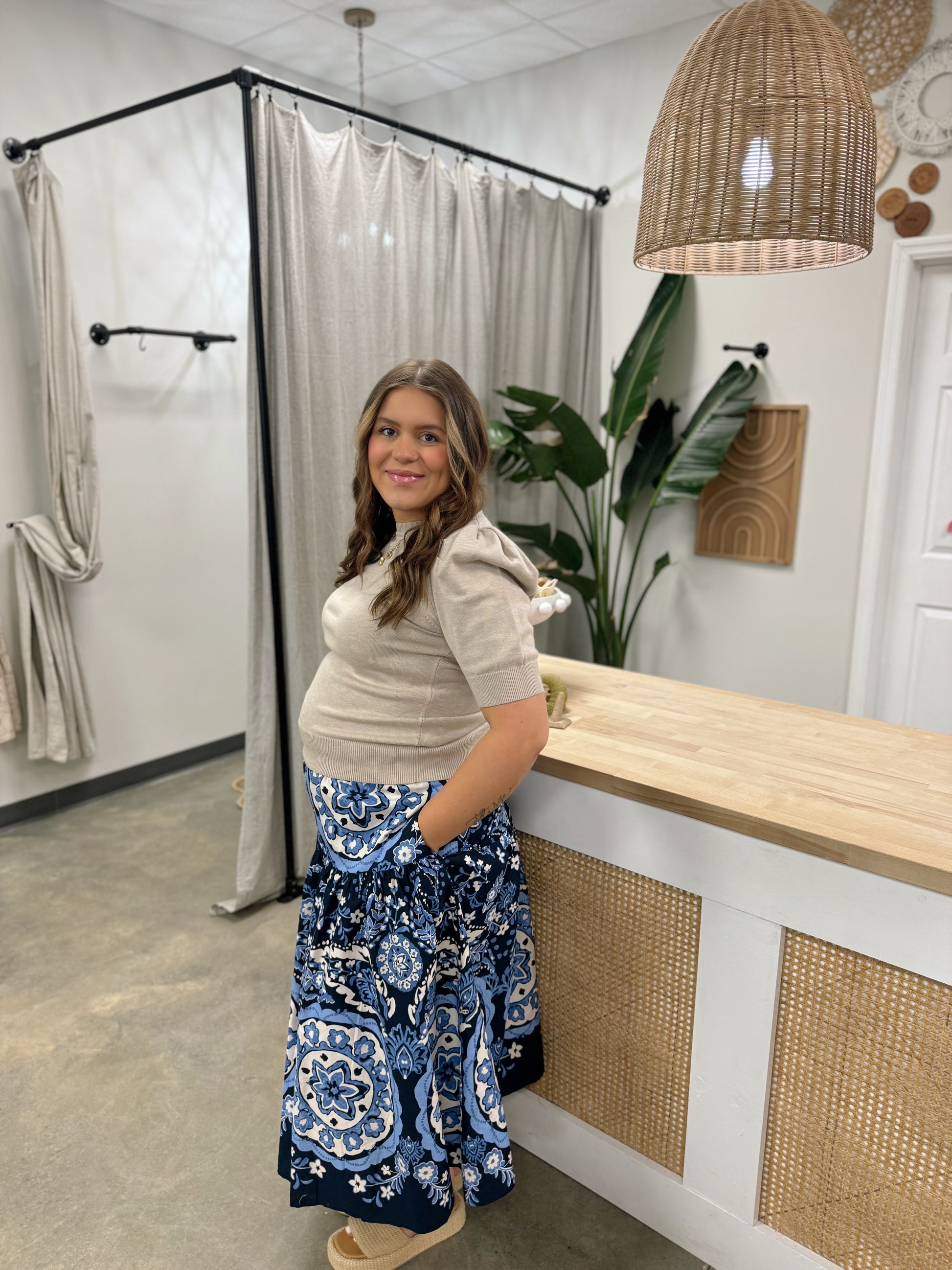 *&merci exclusive print!* Get dressed for any occasion in this printed midi skirt! An alluring exclusive print adorns woven fabric that shapes a smocked elastic high rise waistband. A gathered tiered seam flows down into a classic midi hem with pockets. Add some boots and a cute sweater for the perfect mix of boho and romance! + Printed high rise midi skirt + &Merci exclusive print + Smocked elastic waistband with ruffle trim + High rise fit + Tiered seam + Pockets + Lined +