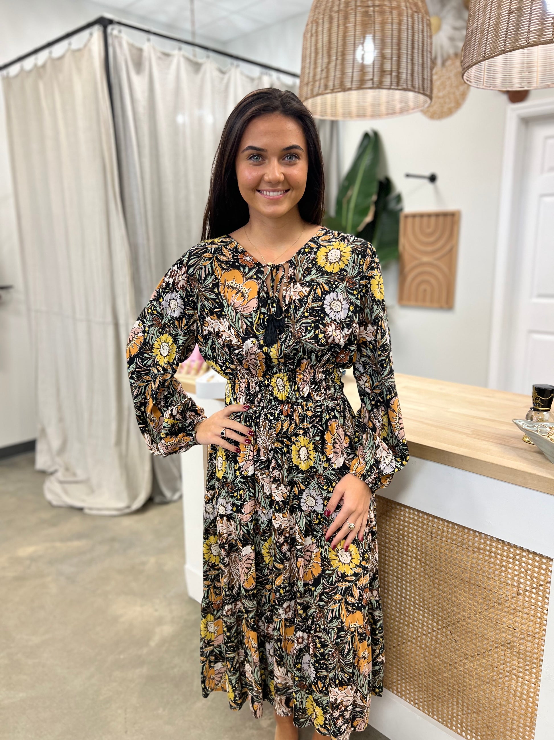 Floral print midi dress featuring a shirred split neck, cinched waist, and long billowy sleeves.