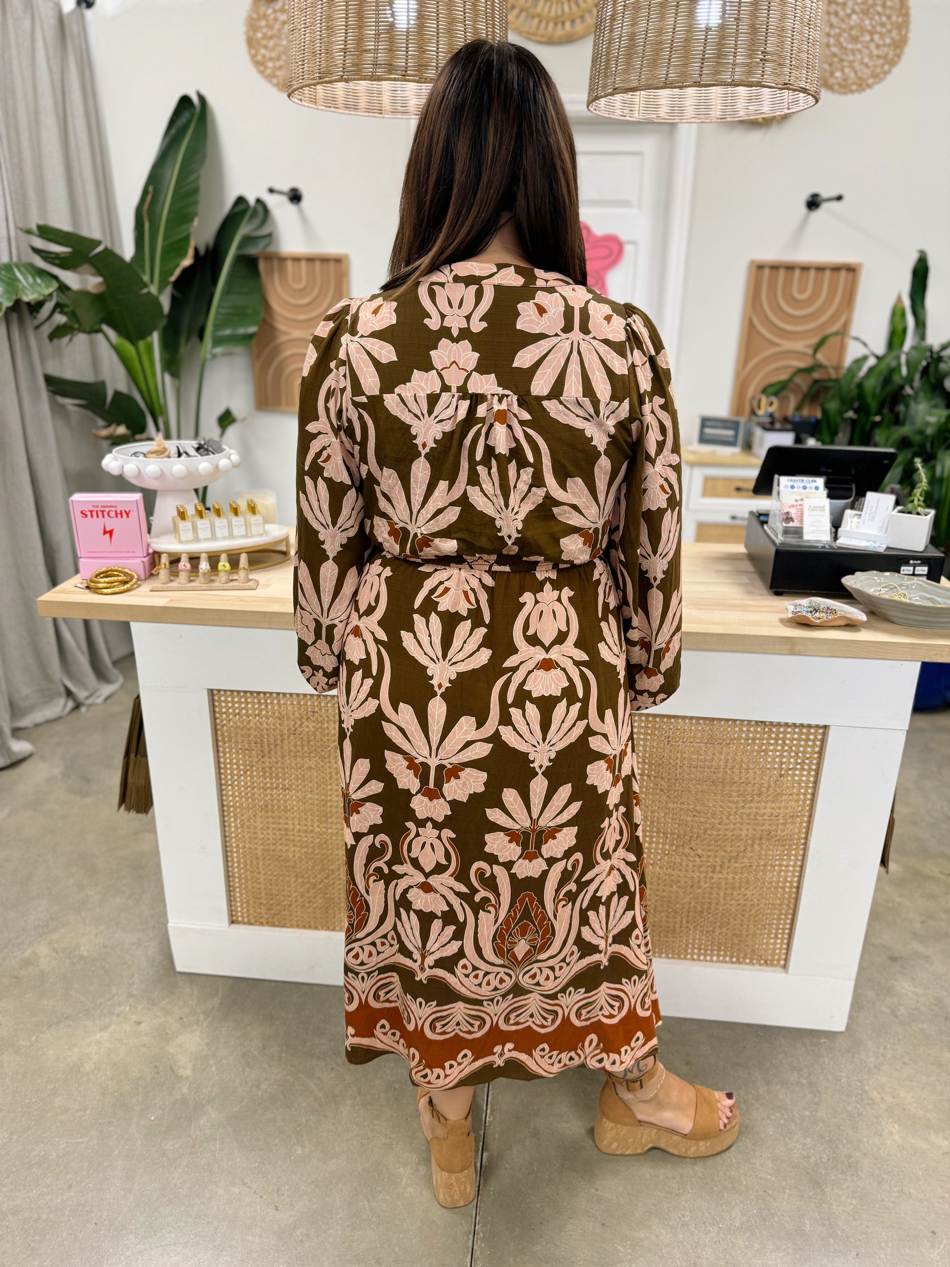+ Floral print midi dress + Round neckline with notched V and tying tassels + Piping detail on neckline and waist + Long puff sleeves with elastic cuffs + Gathered puff shoulders + Smocked elastic on back + Lined +