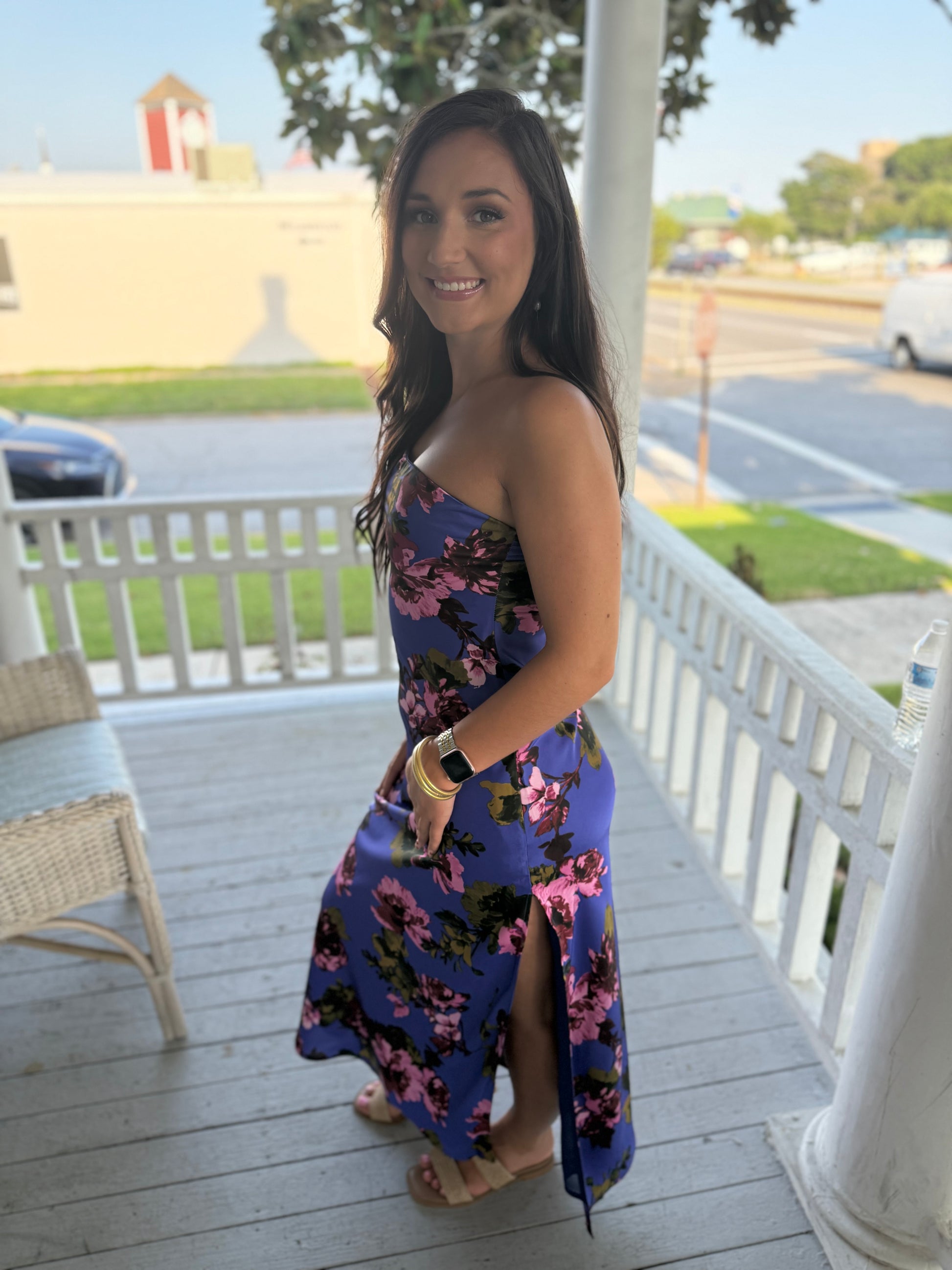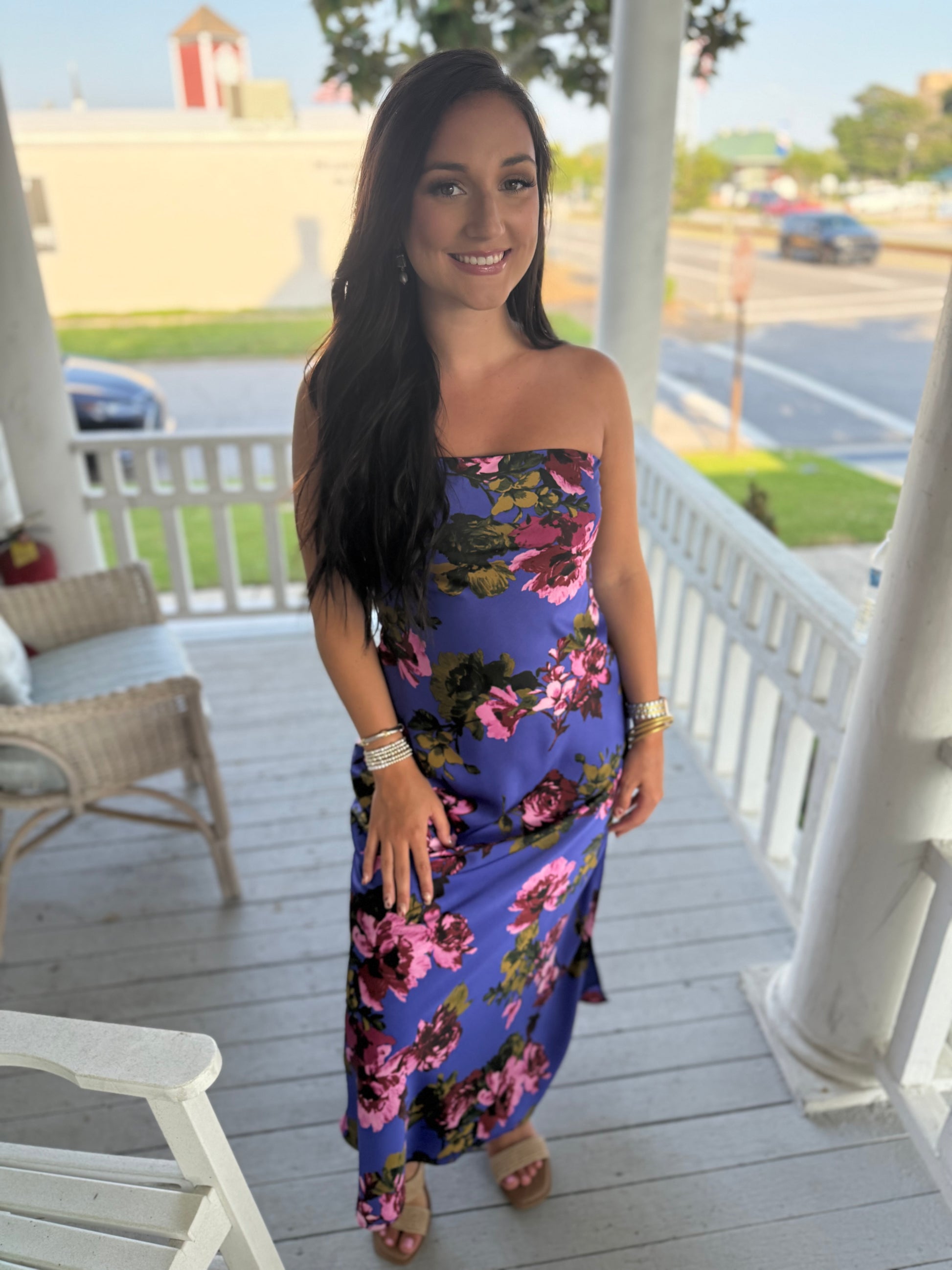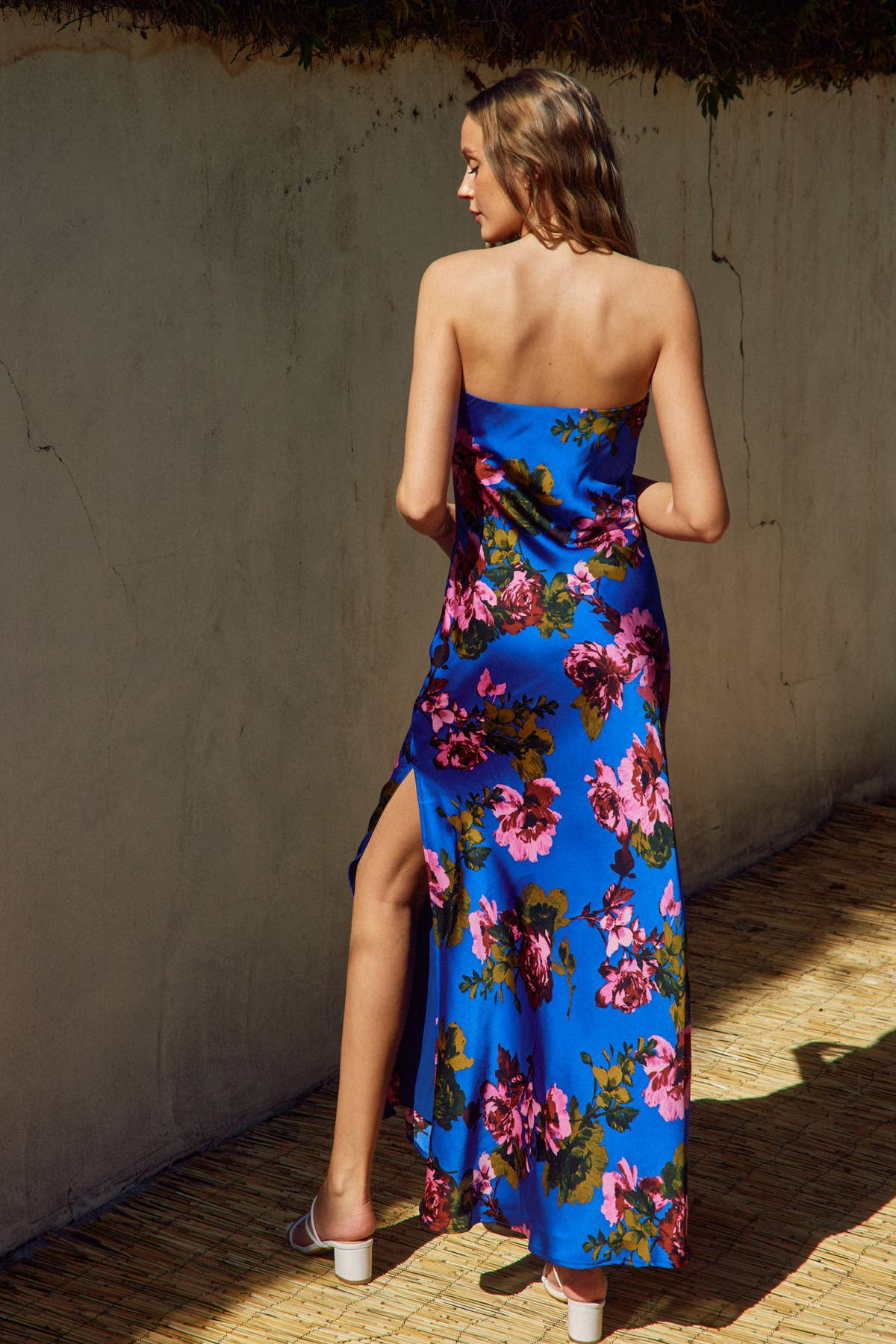 Floral satin strapless maxi dress. Model is 5'7" and wearing size Small. - Elastic band with gel grip tape on the neckline - Side slit - Some stretch from the bias cut - Lined Shell: 100% Polyester Lining: 100% Polyester