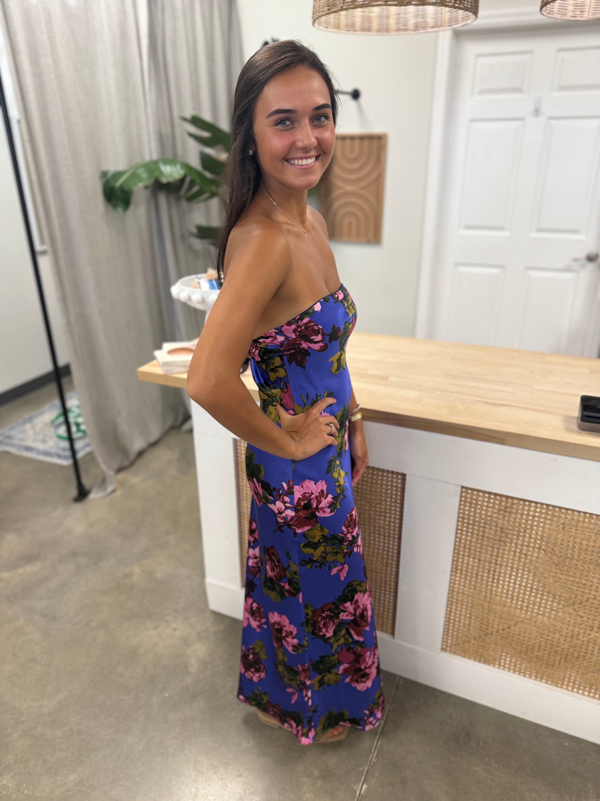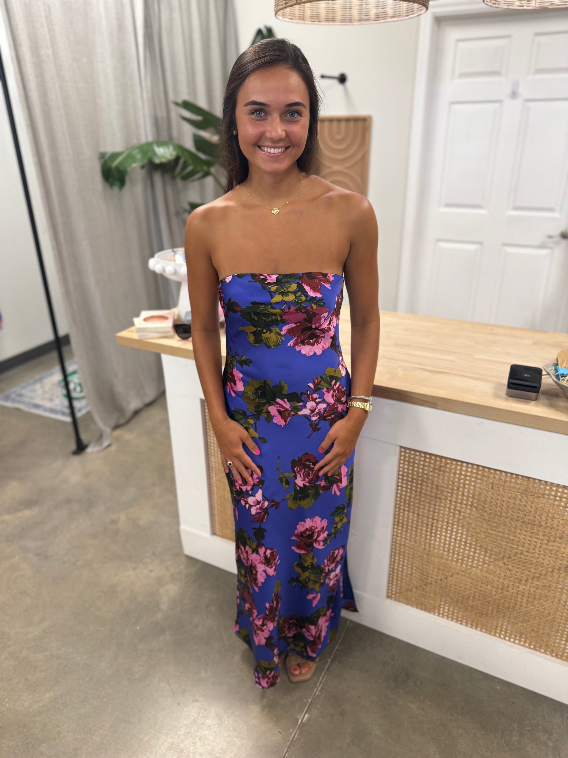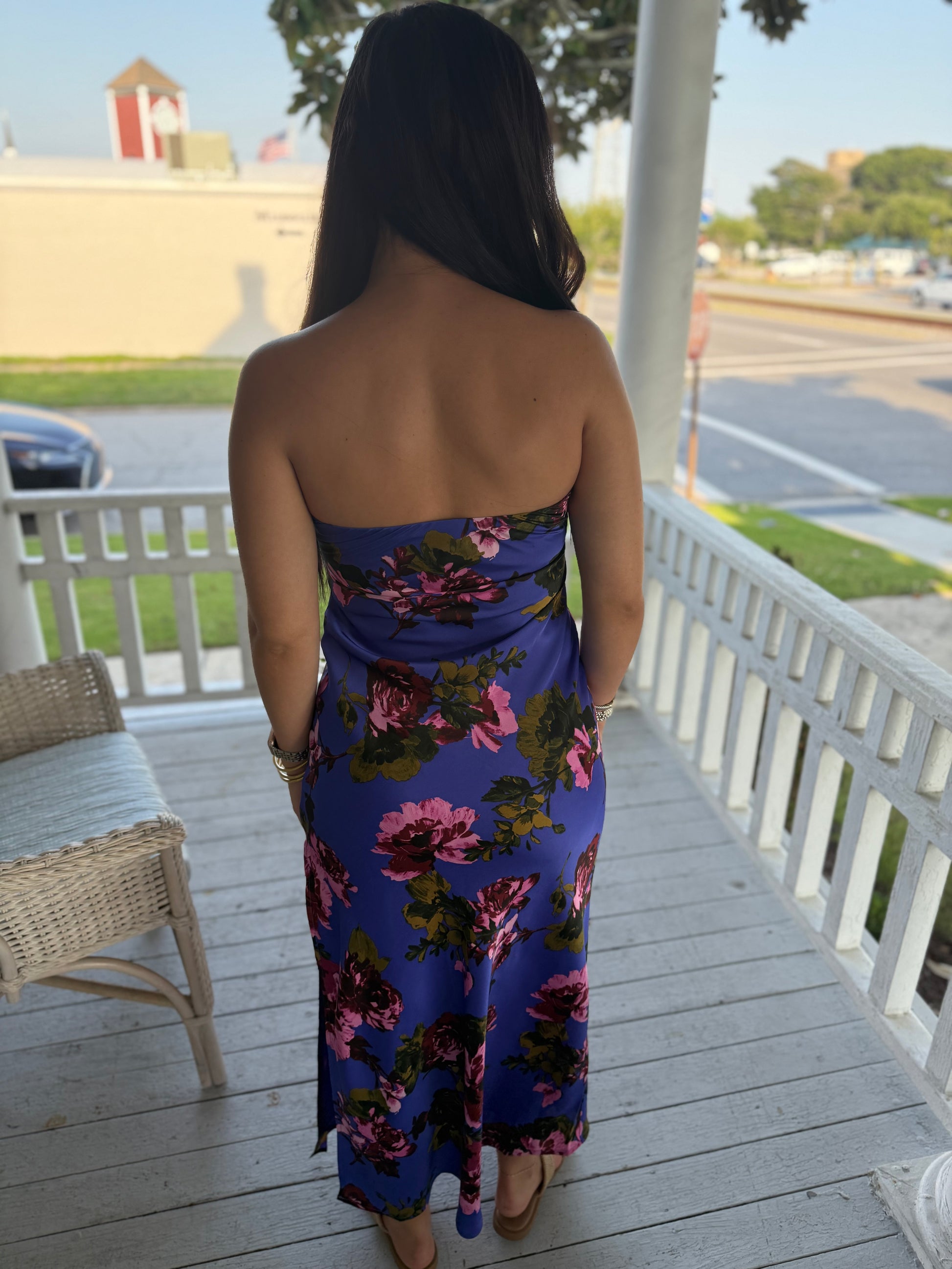 Floral satin strapless maxi dress. Model is 5'7" and wearing size Small. - Elastic band with gel grip tape on the neckline - Side slit - Some stretch from the bias cut - Lined Shell: 100% Polyester Lining: 100% Polyester