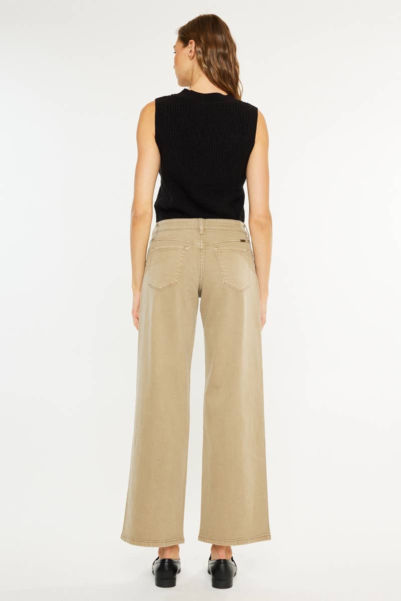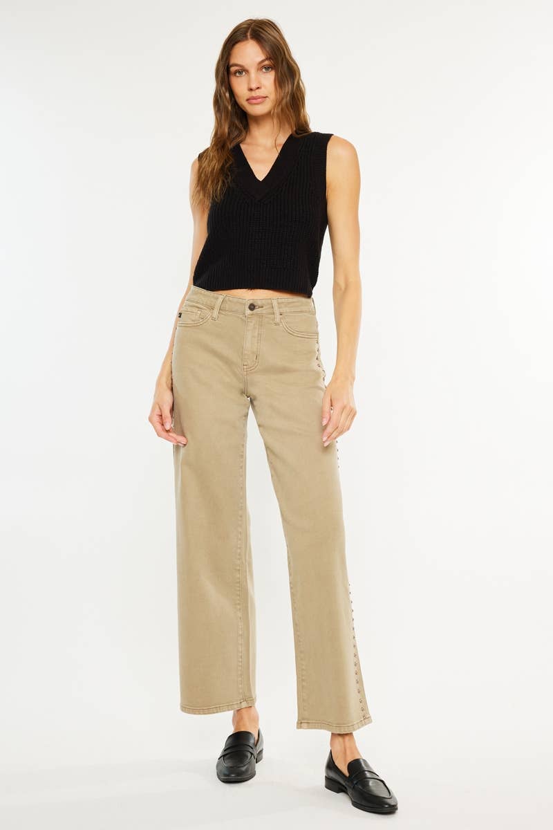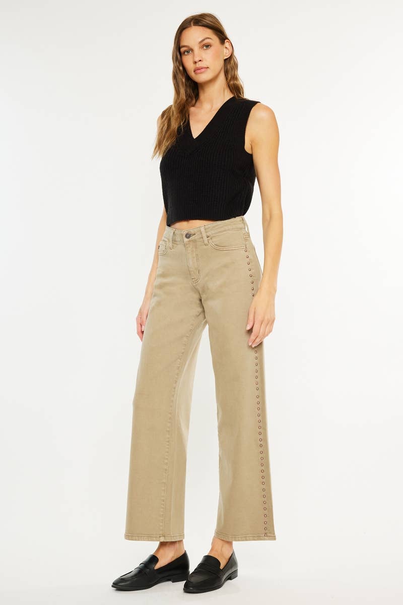 MID RISE WIDE LEG JEANS TAN WASH COMFORT STRETCH NON DISTRESSED STUD DETAIL 5 POCKET STYLE ZIPPER FLY RISE 9.5" INSEAM 30.5" WB 1.5" IN SIZE 5/26