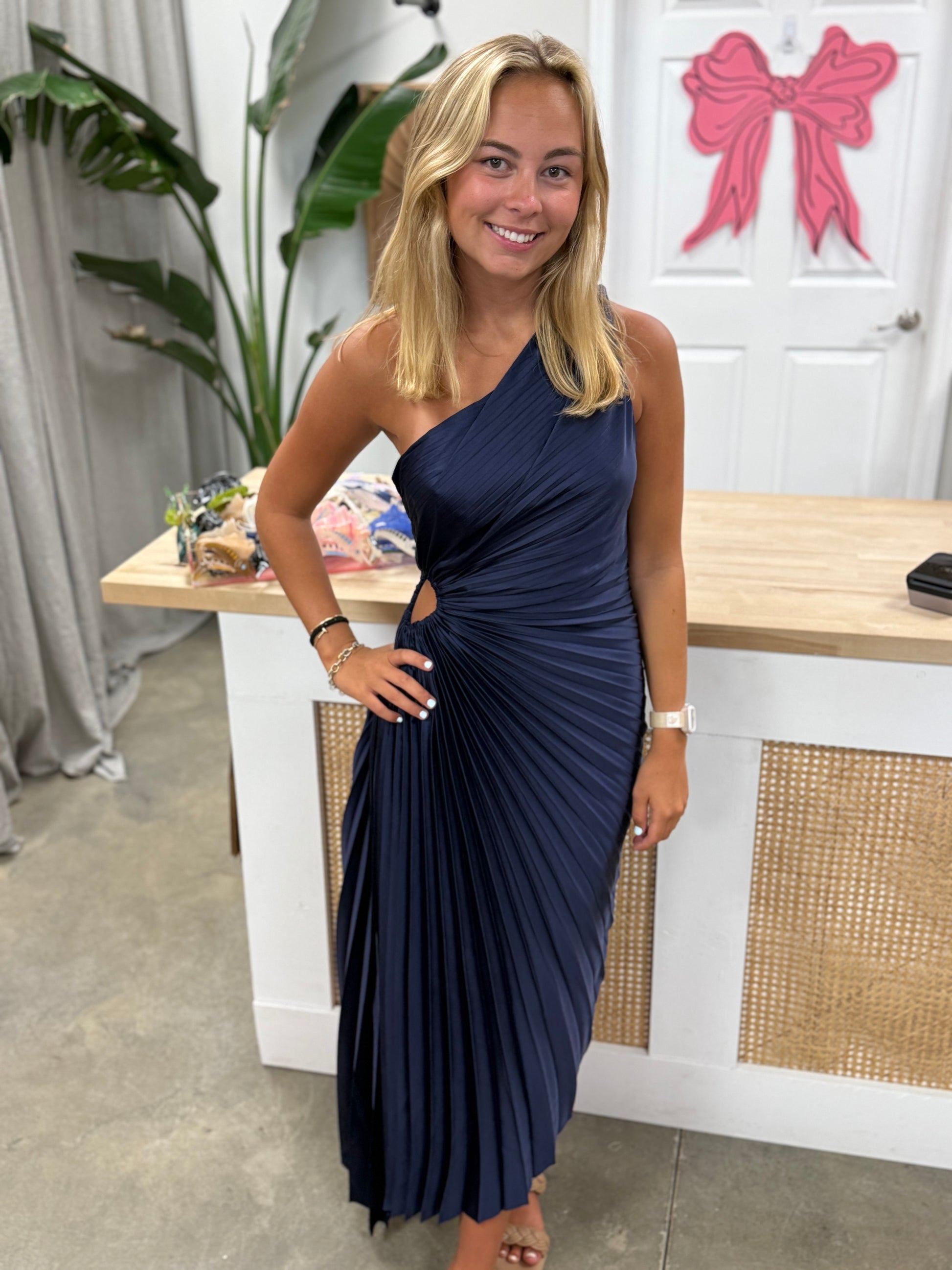All over pleated maxi dress featuring an asymmetrical design. One shoulder - Asymmetrical hem - Side keyhole detail - Hidden side zipper closure -