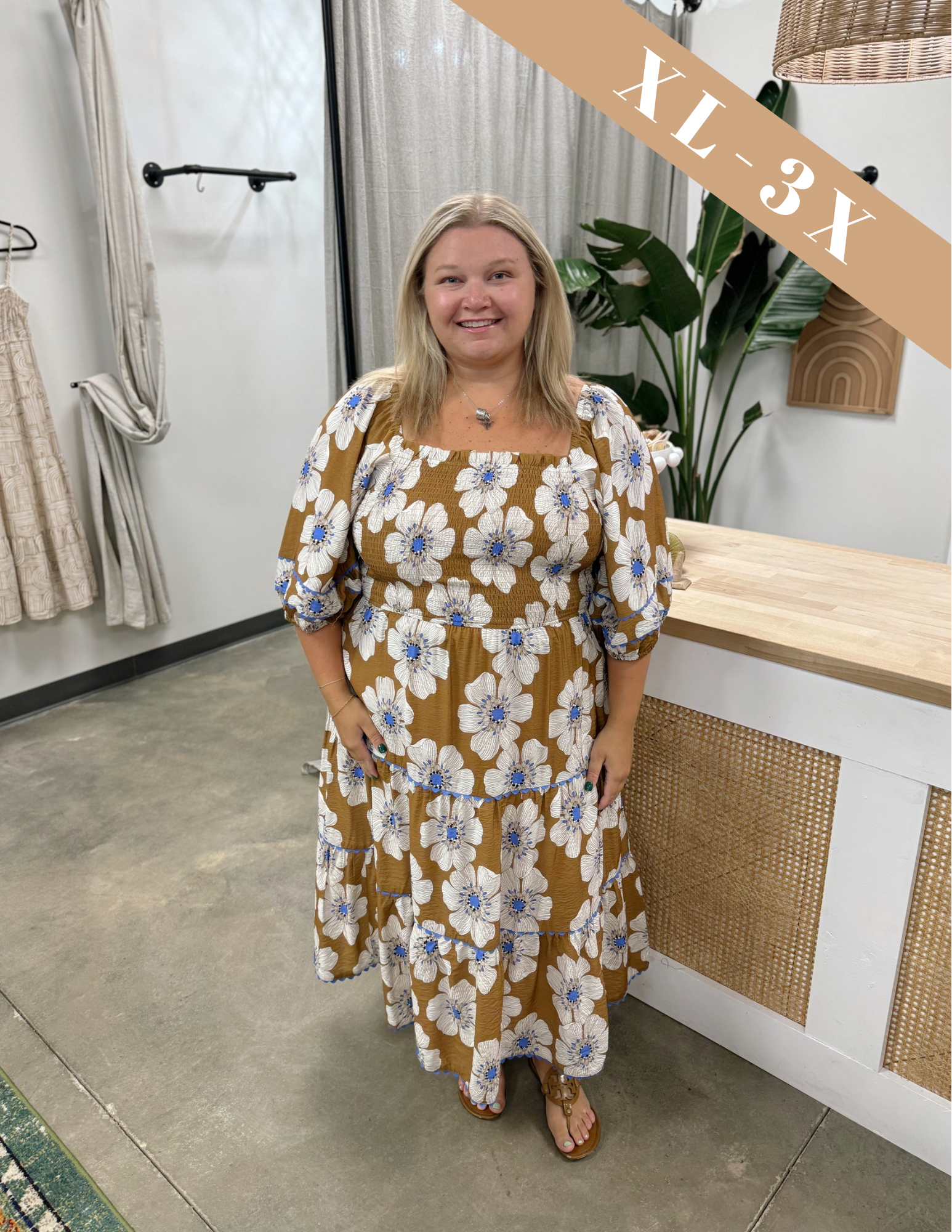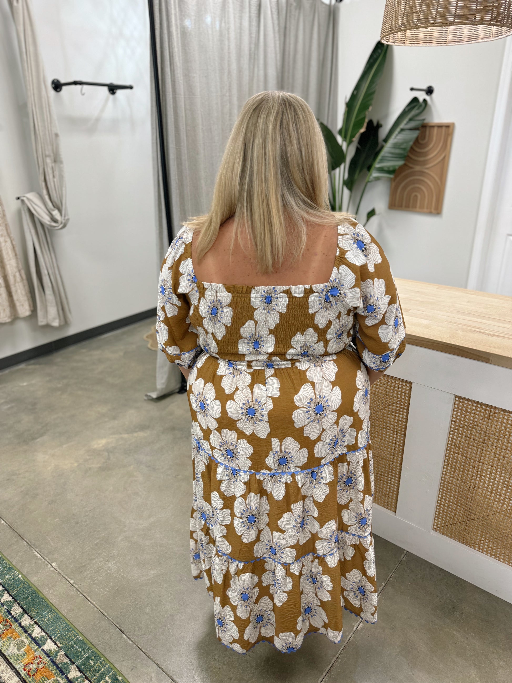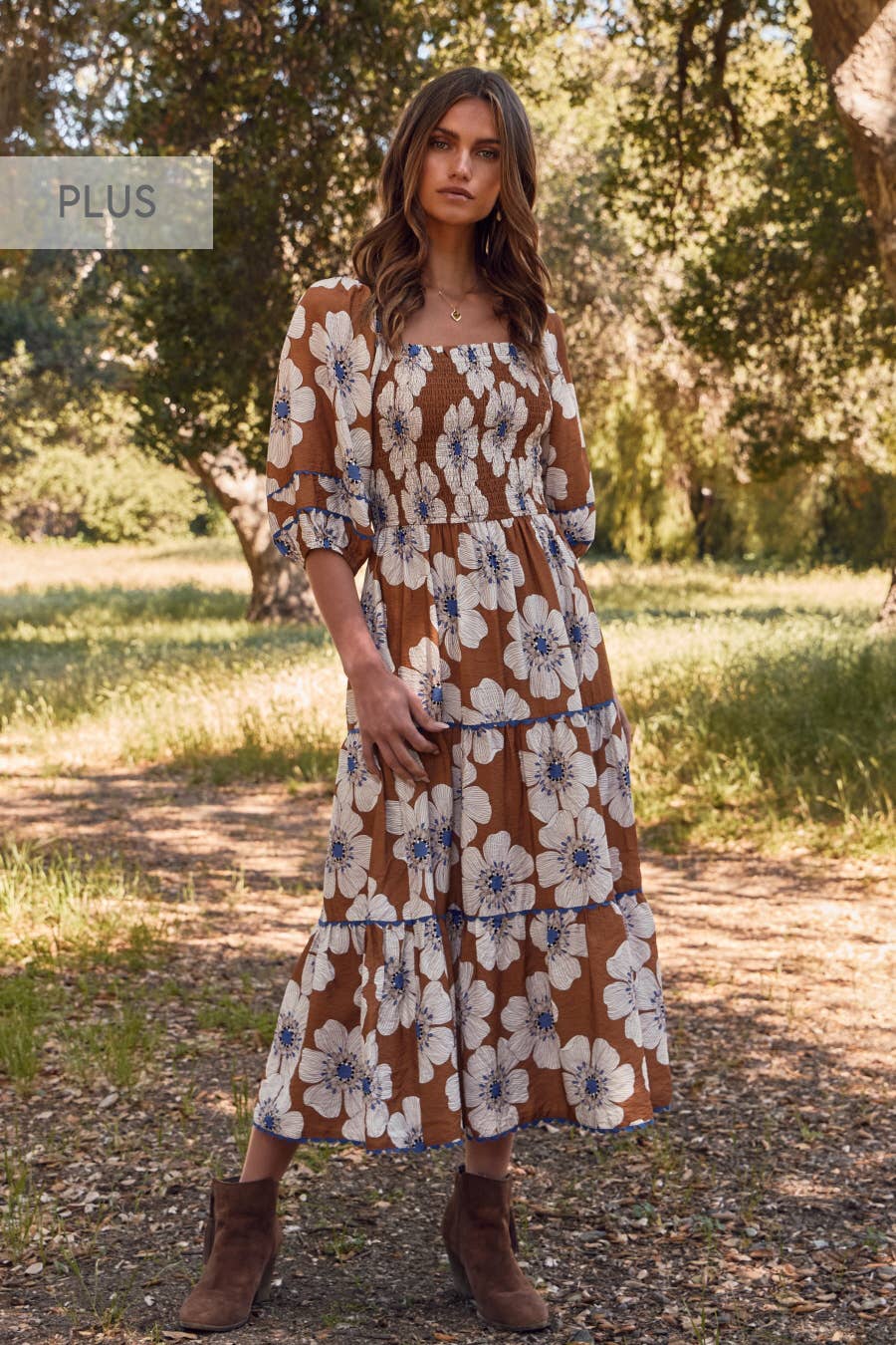 Floral printed tiered midi dress featuring puffed sleeves and a smocked bodice.