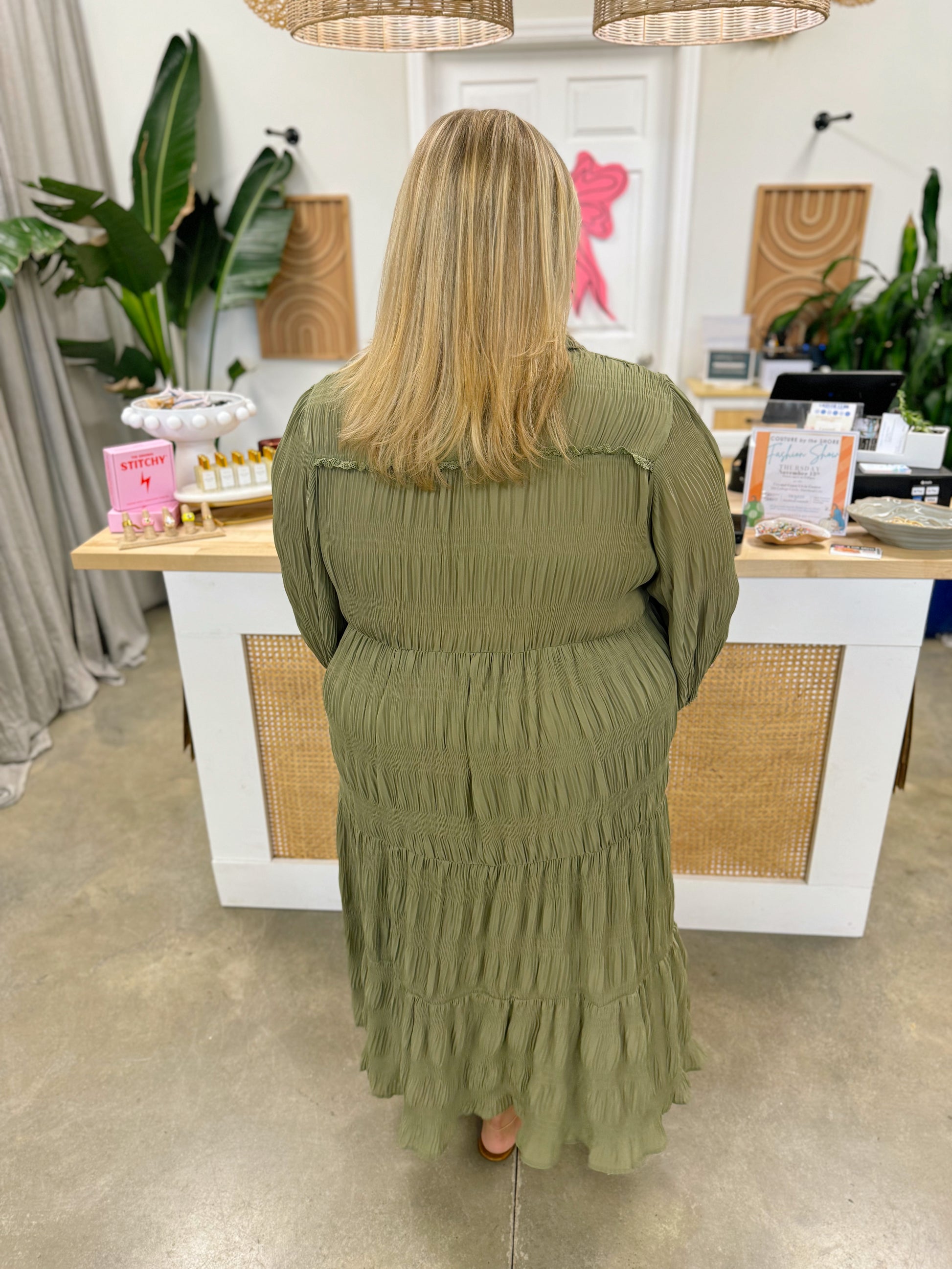 This flowy midi dress features a crinkled textured fabric with tiered detailing for a soft, feminine silhouette. Designed with a collared V-neckline and subtle front ruffle accents, it brings an elevated touch to everyday dressing. The long balloon sleeves and lightweight material make it a breezy and comfortable choice for any season.