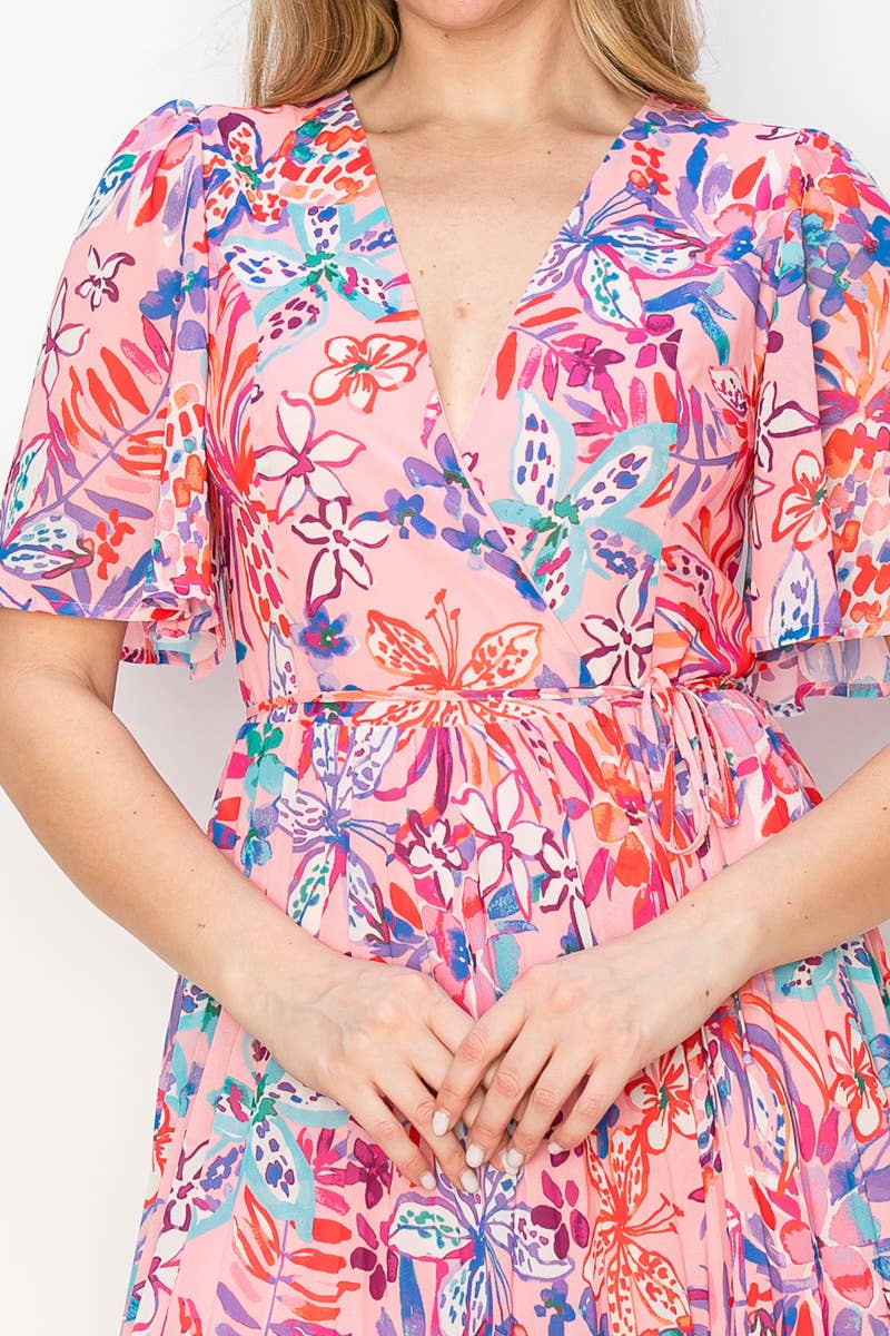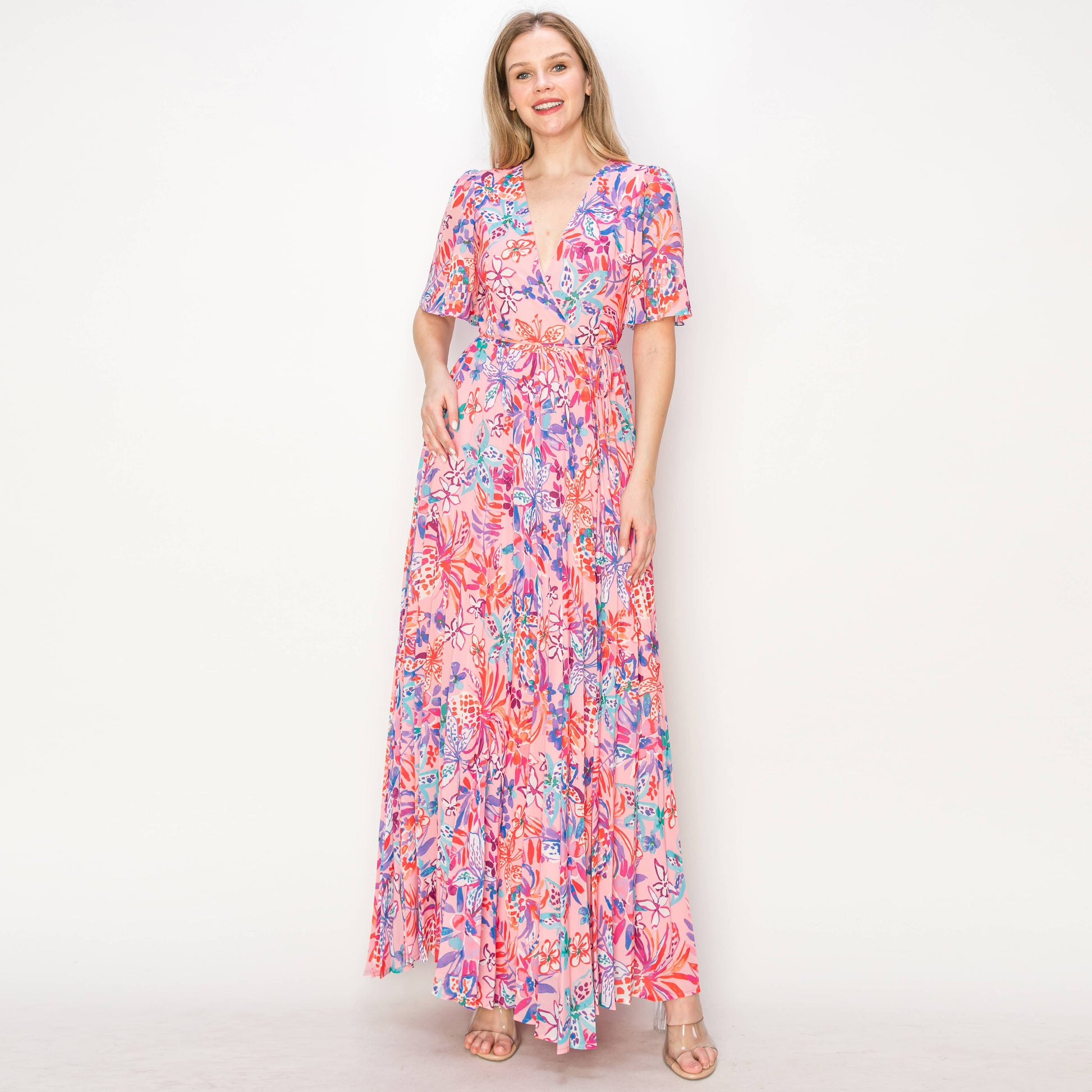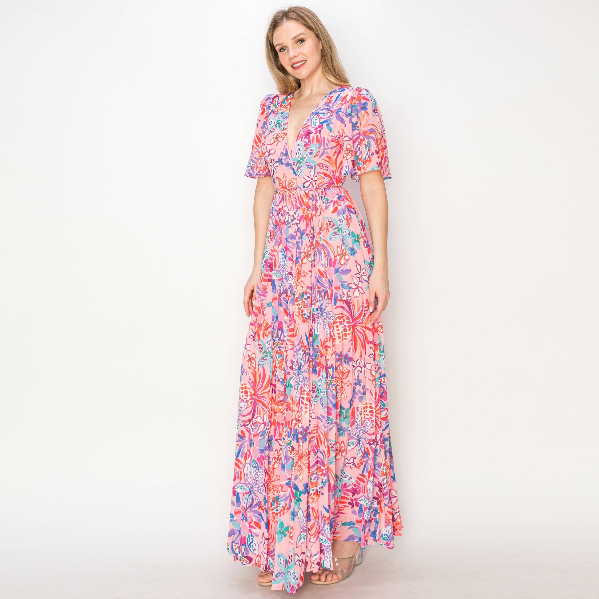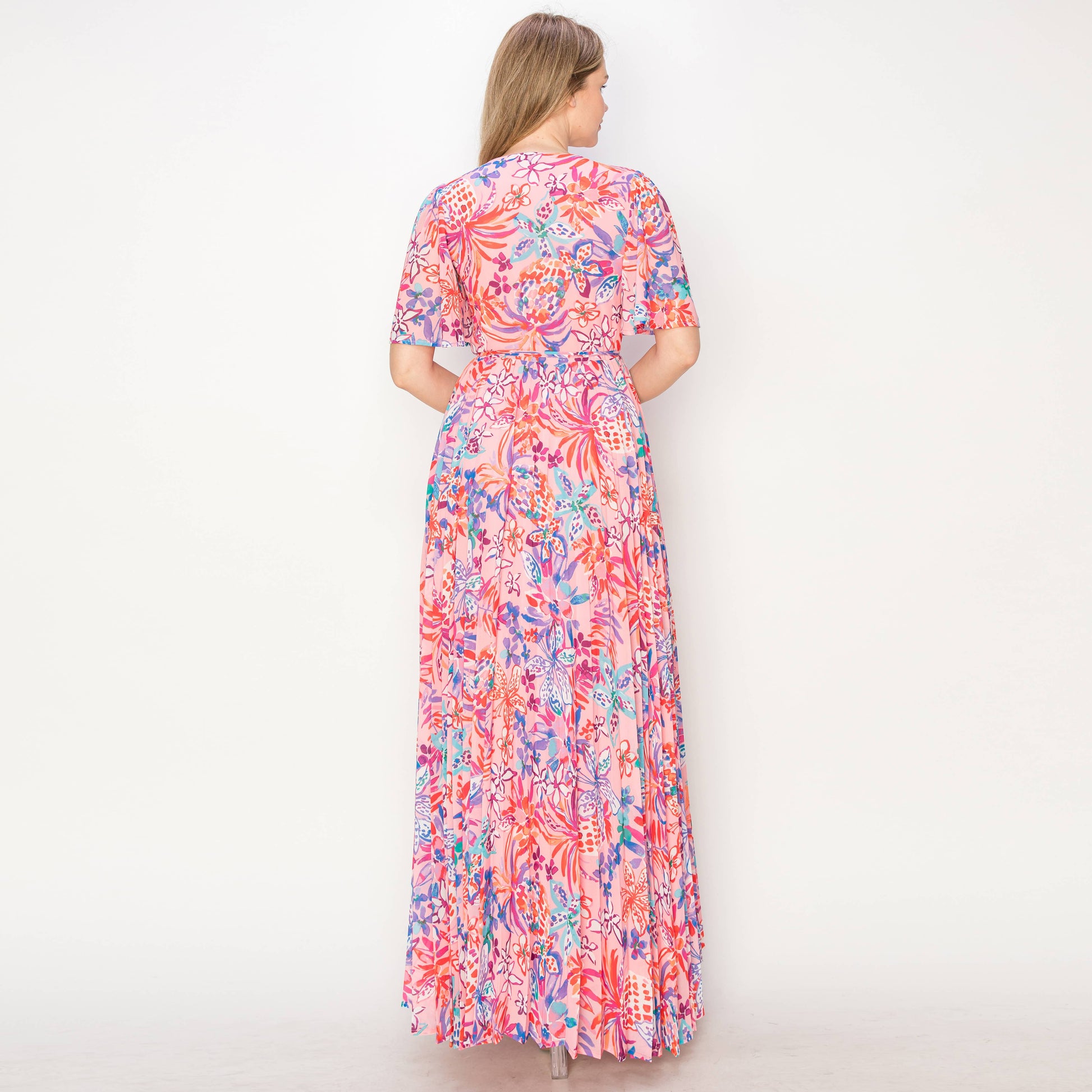 - Pink semi tropical print maxi dress - True wrap style design - Flare kimono sleeves - Full lining - Fabric Content SELF - 100% POLYESTER LINING - 100% POLYESTER
