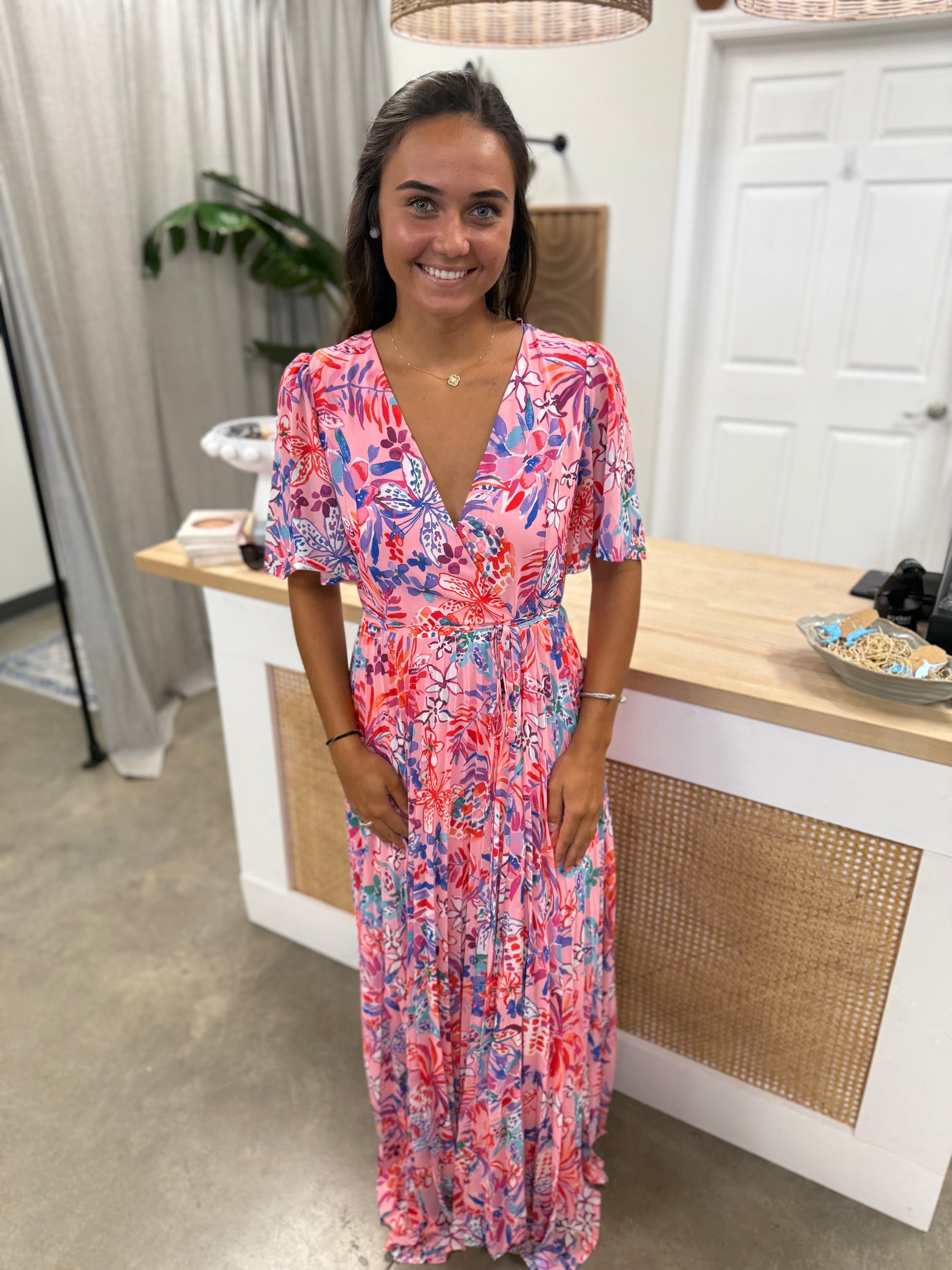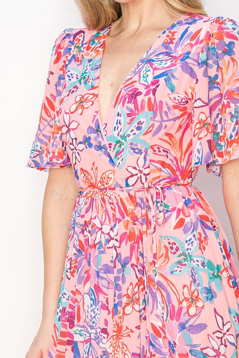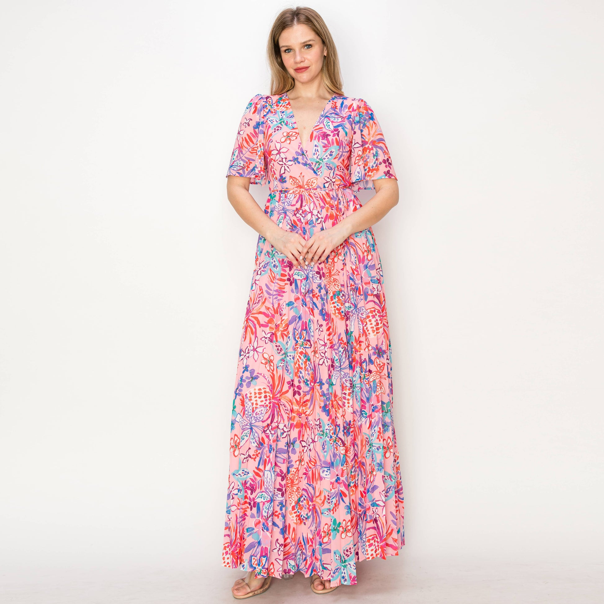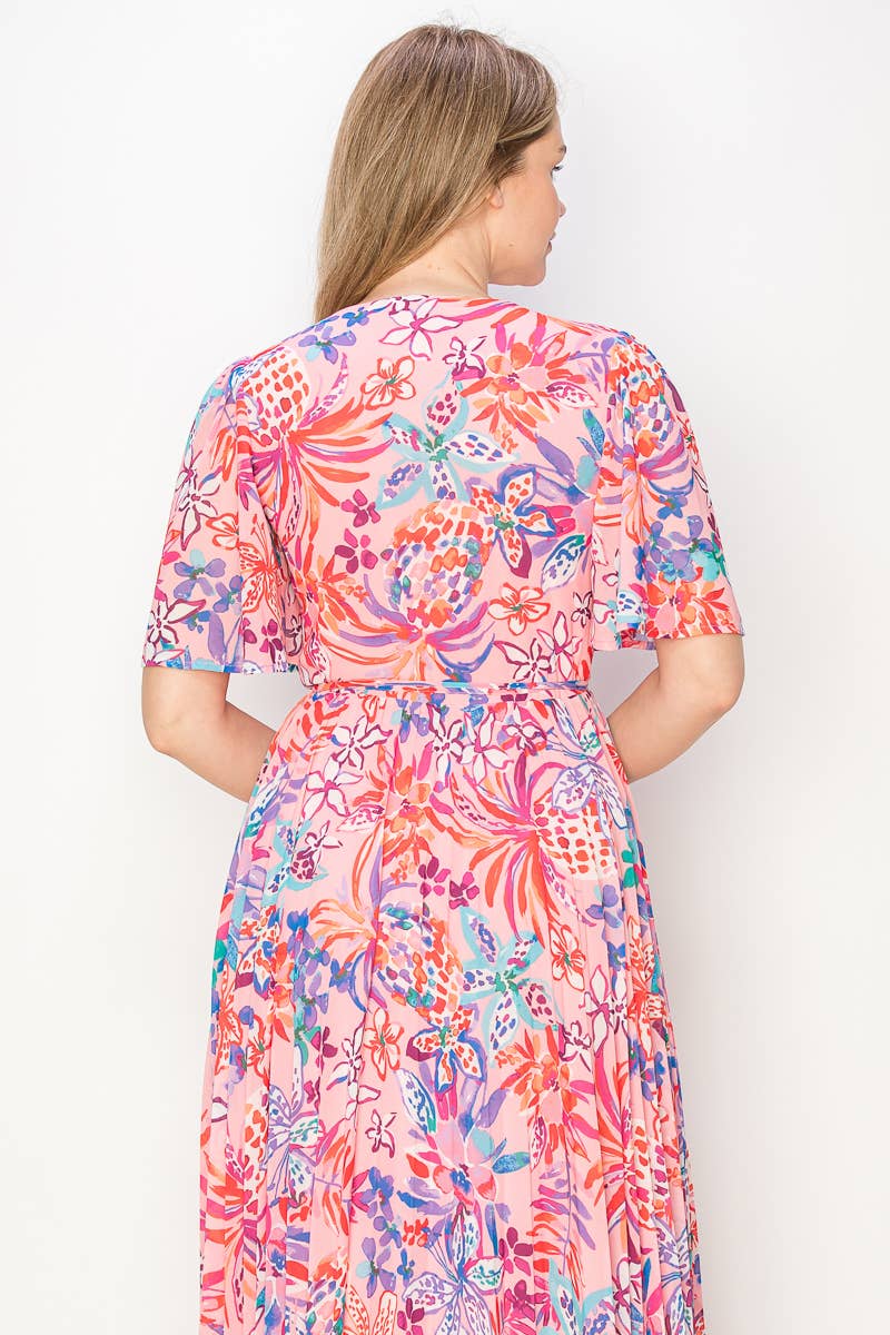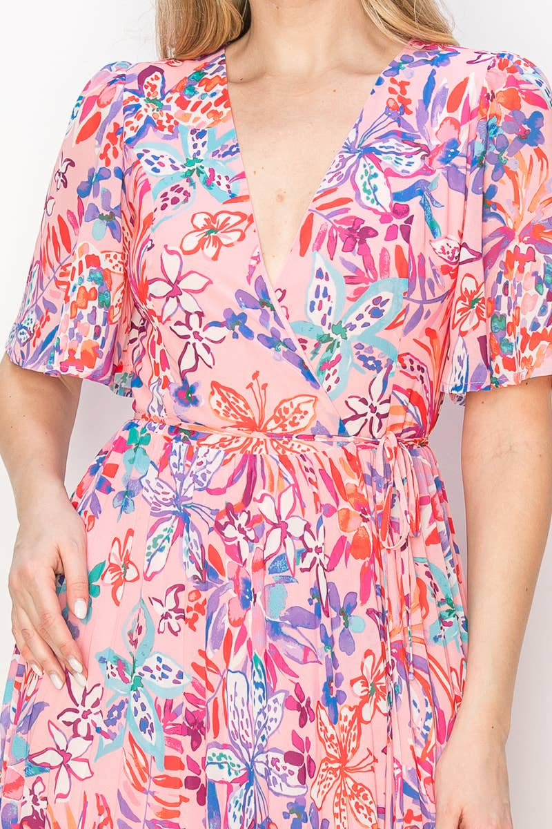 - Pink semi tropical print maxi dress - True wrap style design - Flare kimono sleeves - Full lining - Fabric Content SELF - 100% POLYESTER LINING - 100% POLYESTER