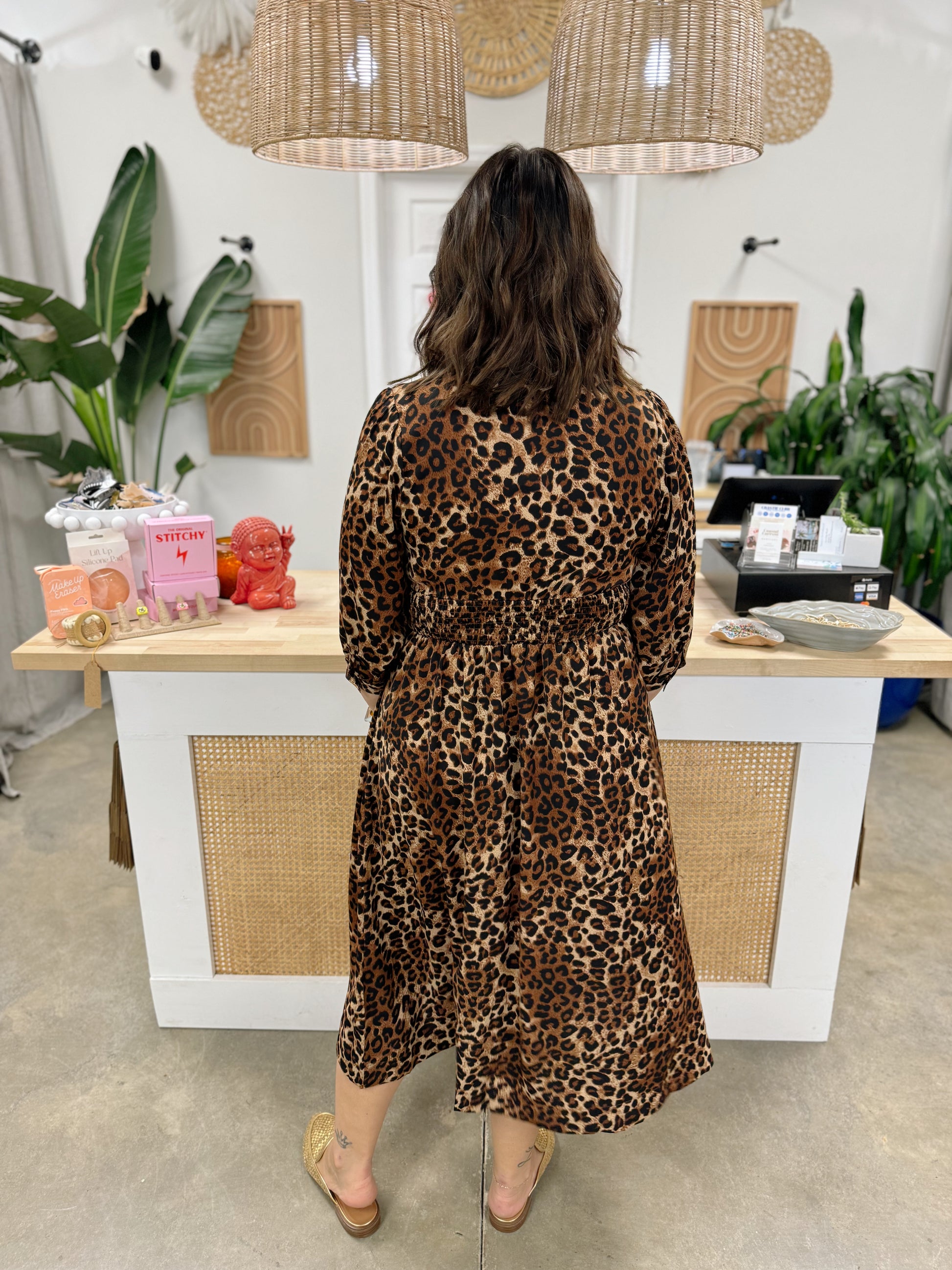 Leopard Print Zip-Front Midi Dress with Smocked Waist