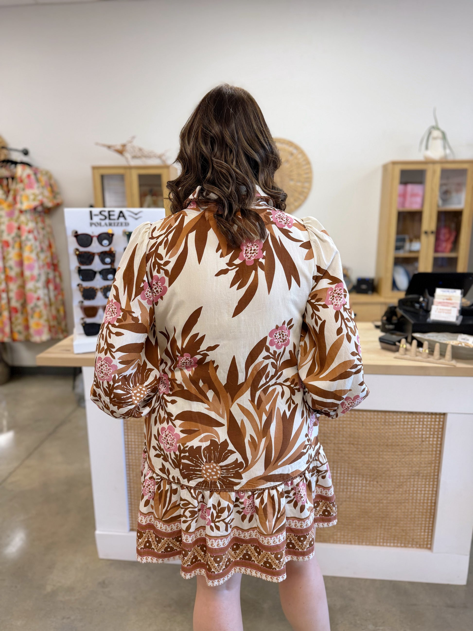 Long puff sleeves floral dress with side pockets, front button down, collared neckline, ruffled hem, lace trim accent. Fabric Contents