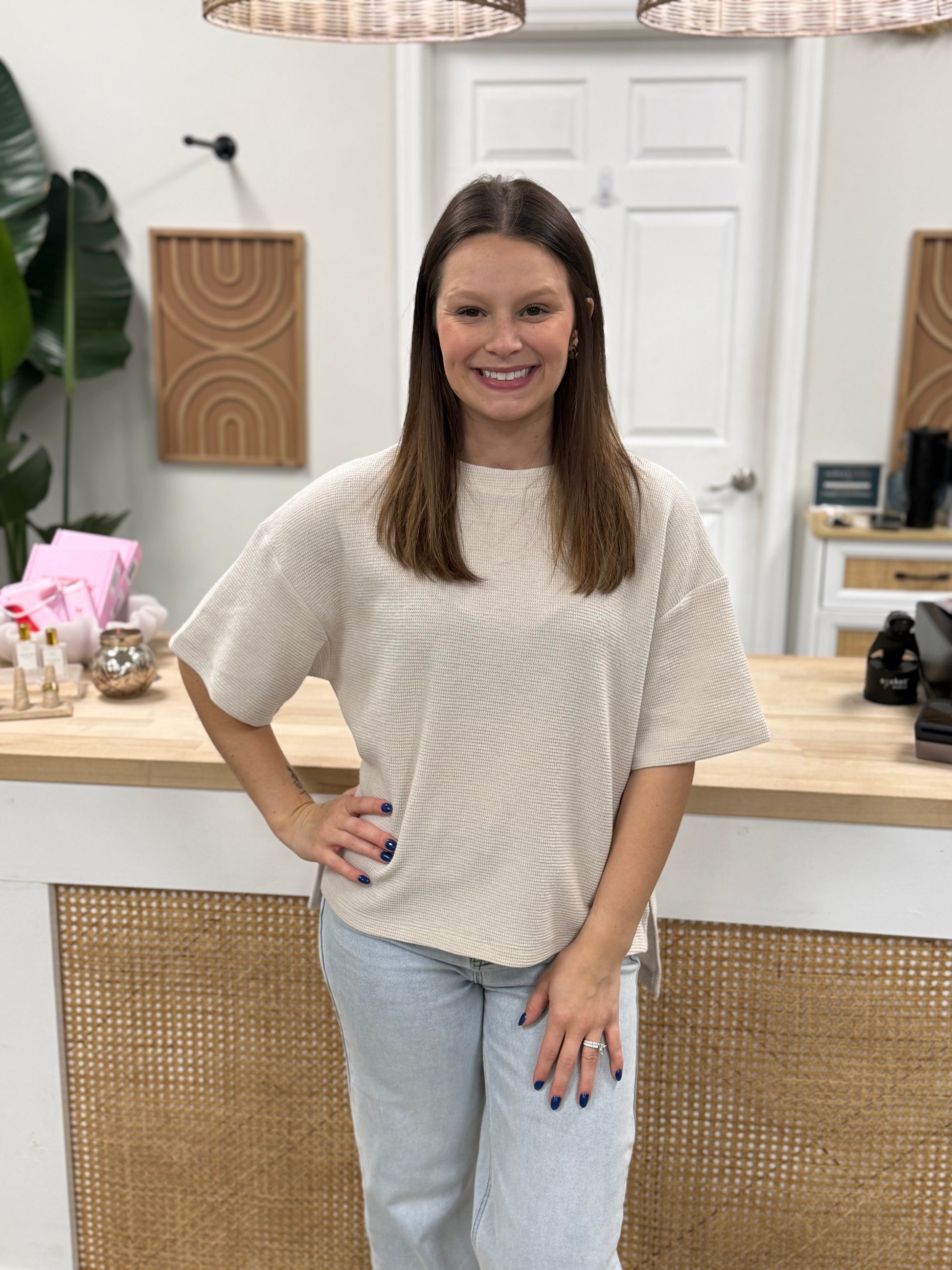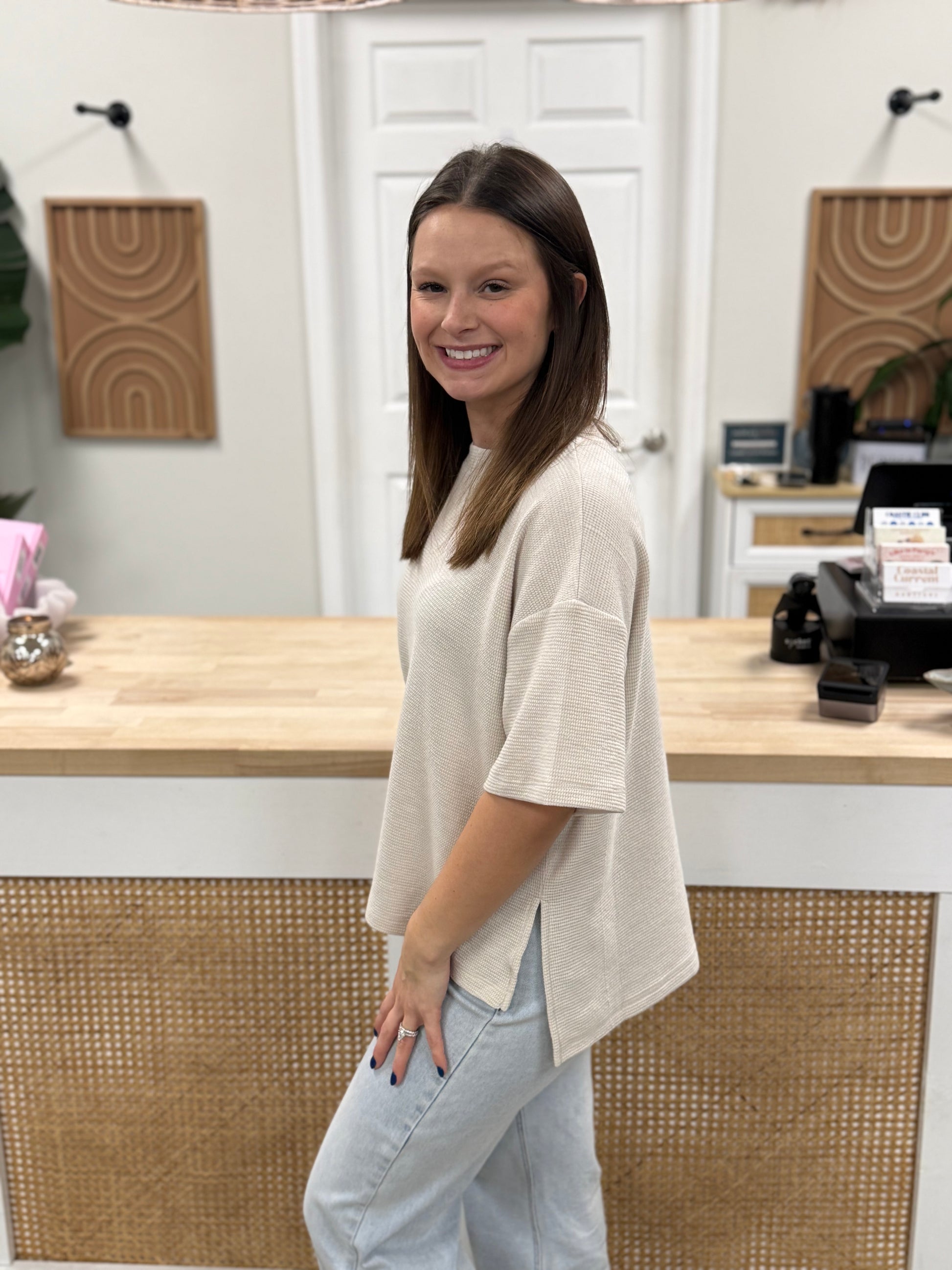 DOUBLE KNIT SIDE SLITS HI-LOW SHORT SLEEVE TOP TOTAL BODY LENGTH: 21.5"(FRT),24"(BACK) BUST: 44.5" approx.