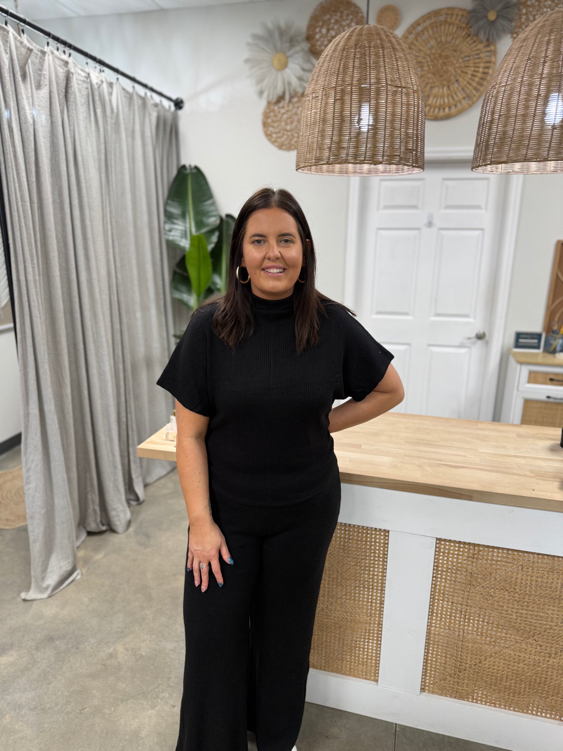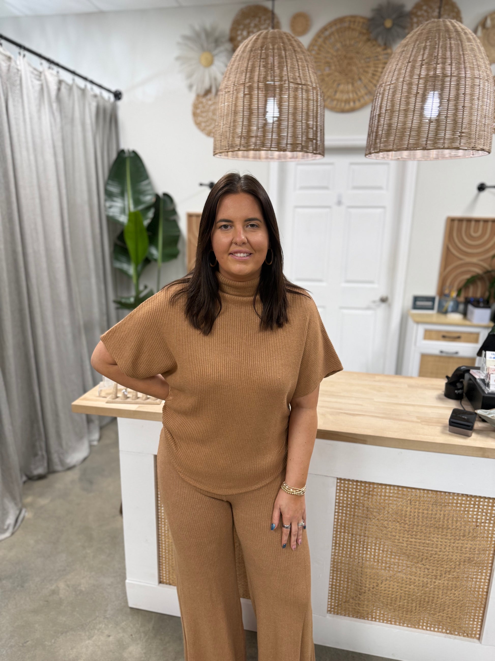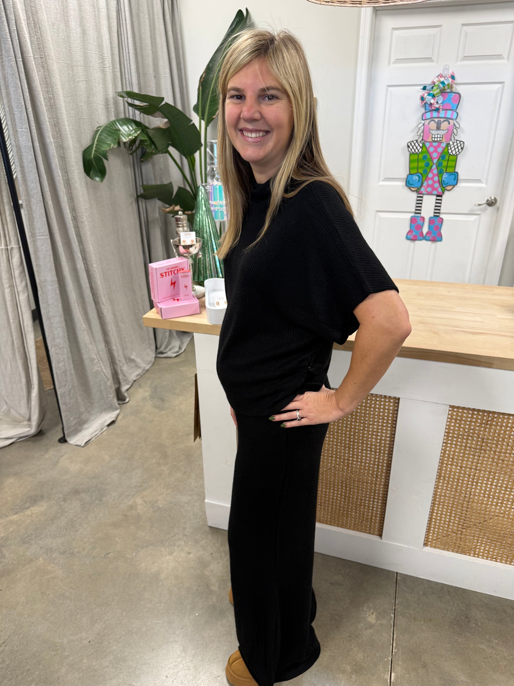 SWEATER MOCK NECK SHORT SLEEVE TOP & LONG PANTS SET **TOP TOTAL BODY LENGTH: 24.5", BUST: 51.5" approx. - SIDE SHIRRING - MEASURED FROM SMALL **PANTS TOTAL WAIST: 24", INSEAM: 31" approx. - MEASURED FROM SMALL
