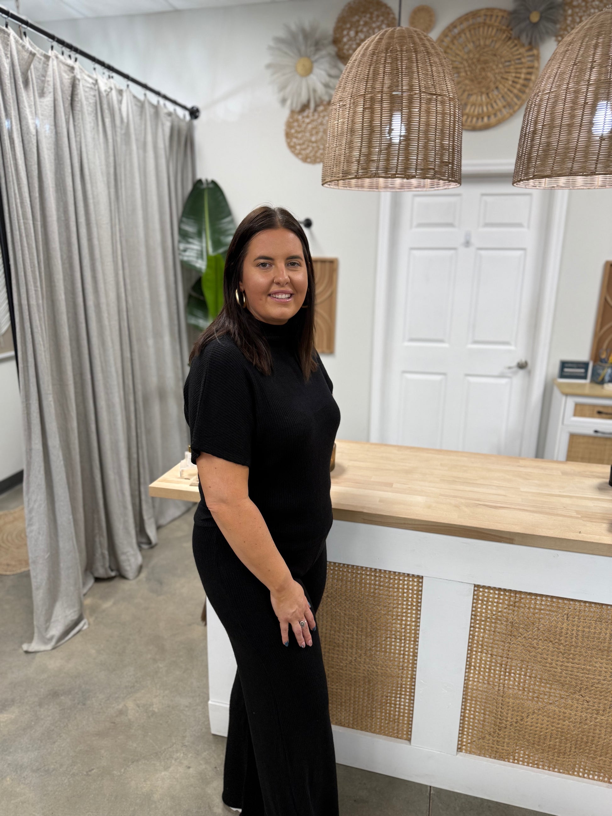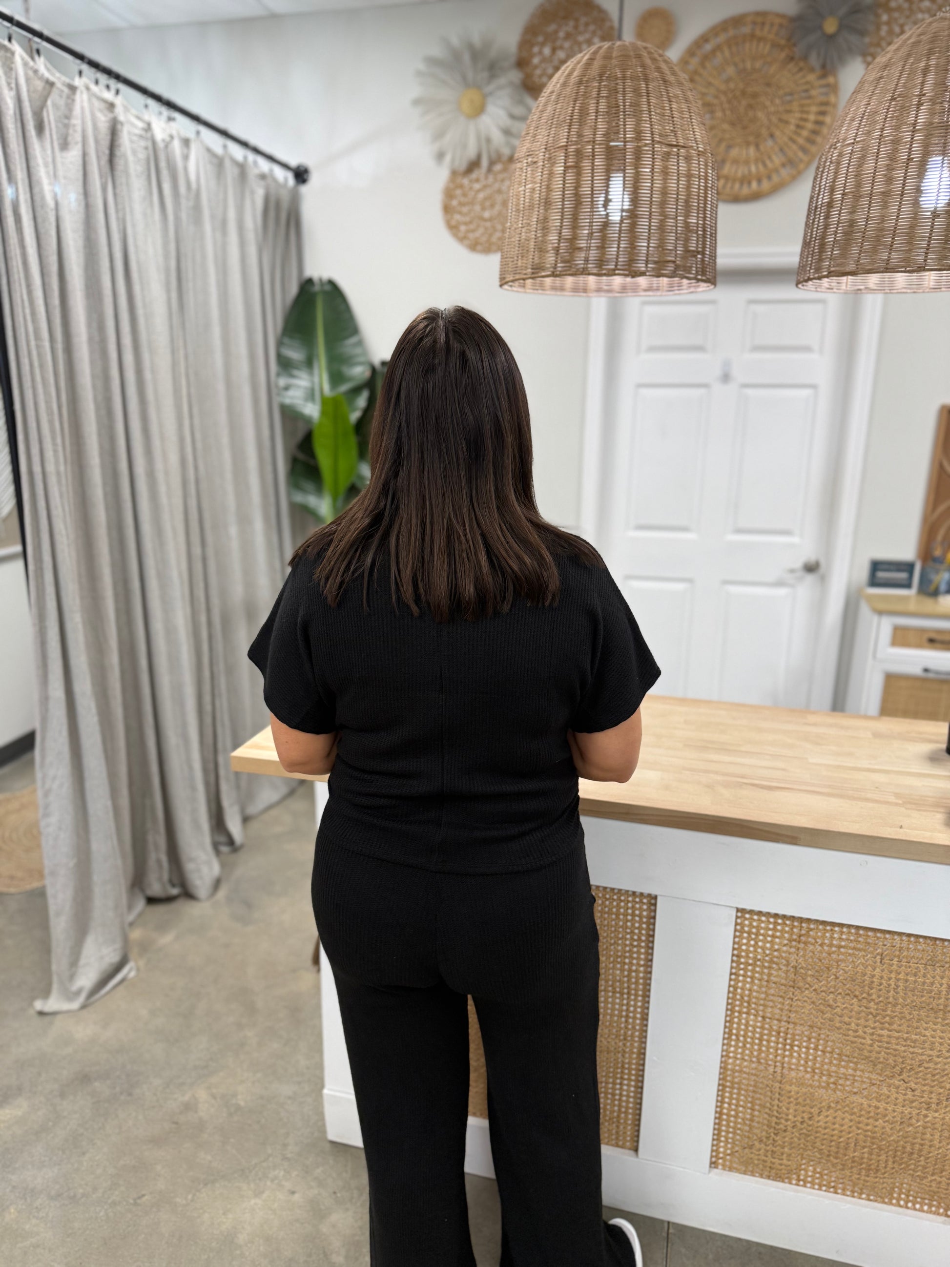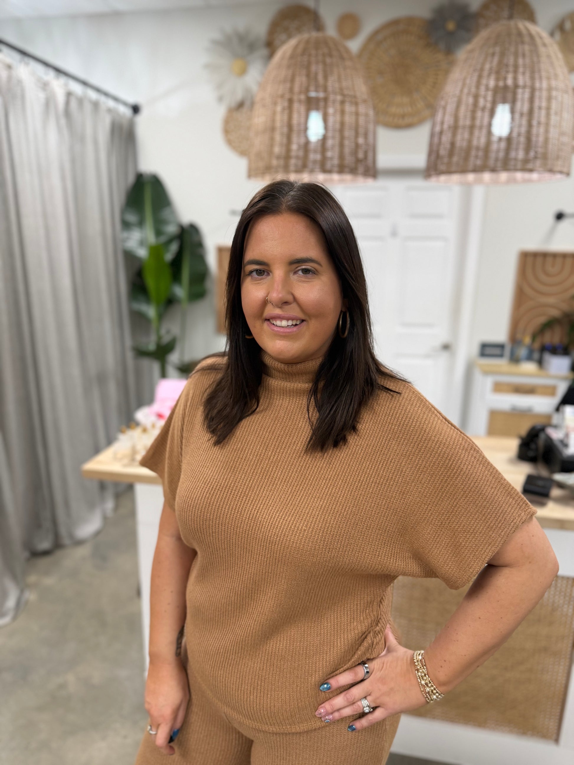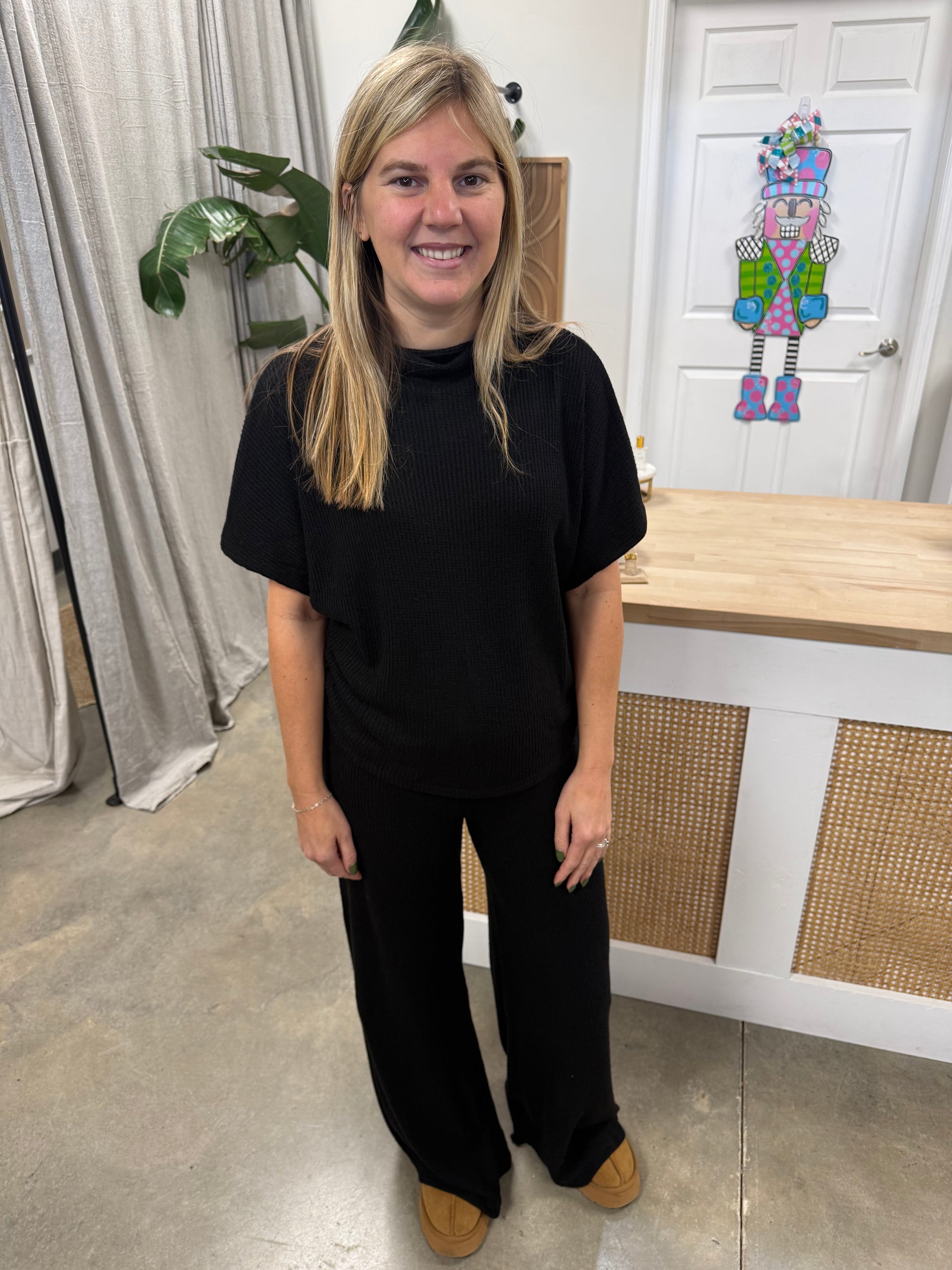 SWEATER MOCK NECK SHORT SLEEVE TOP & LONG PANTS SET **TOP TOTAL BODY LENGTH: 24.5", BUST: 51.5" approx. - SIDE SHIRRING - MEASURED FROM SMALL **PANTS TOTAL WAIST: 24", INSEAM: 31" approx. - MEASURED FROM SMALL
