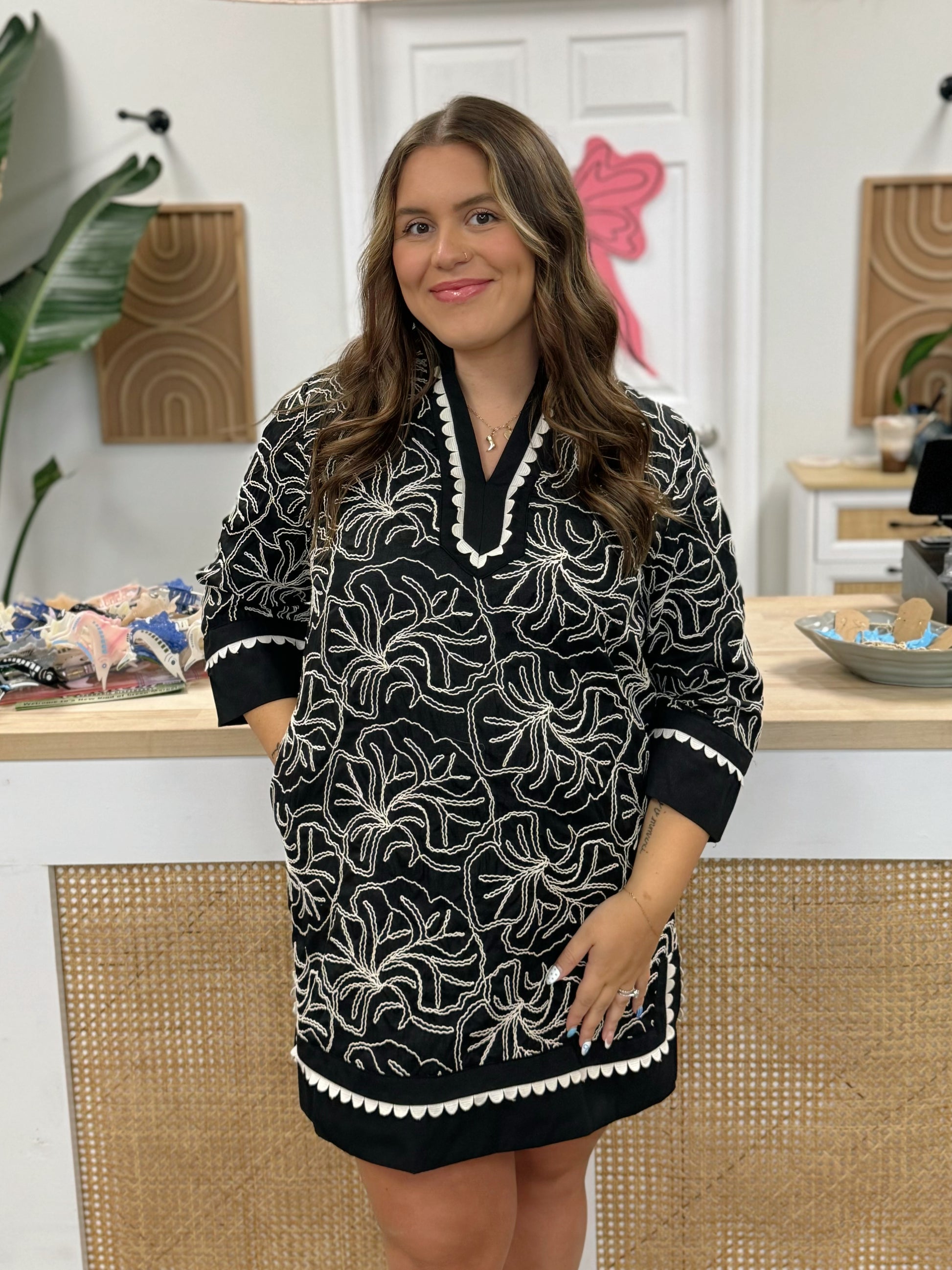 Embroidered Notch Neck Dress with 3/4 Length Sleeves and a Decorative Trim