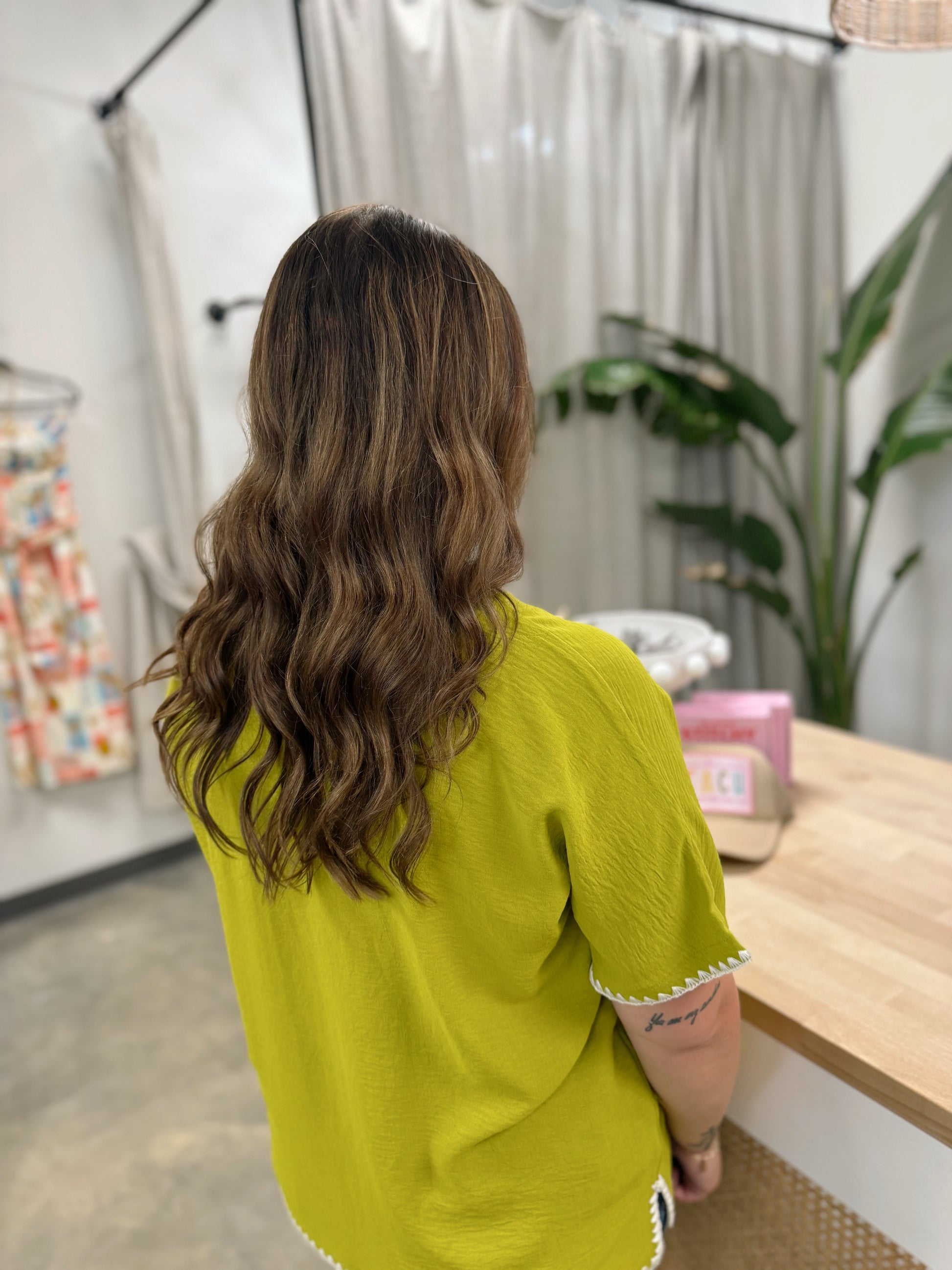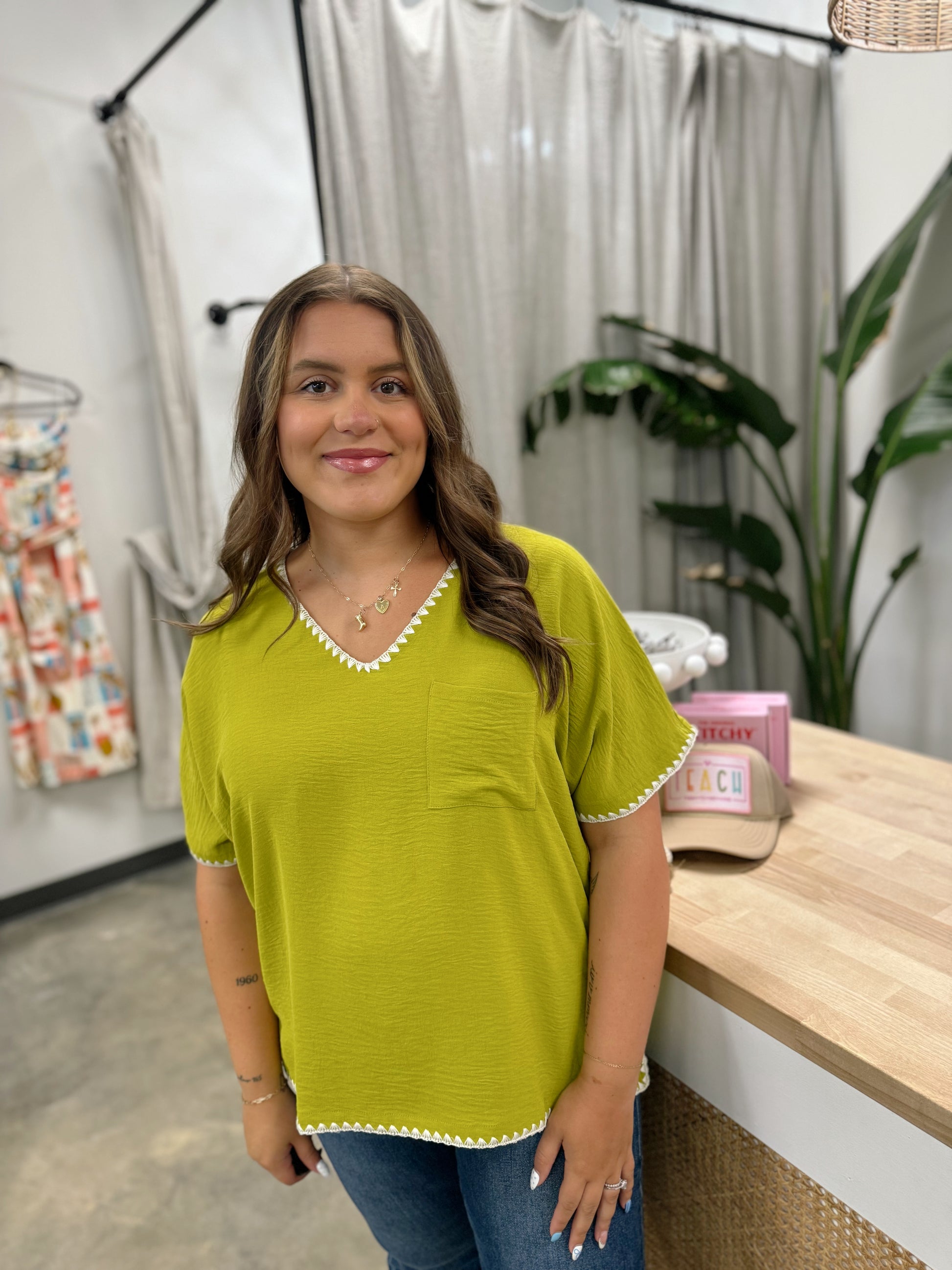 Shell stitch detail loose fit top, textured fabric, drop shoulder, chest pocket, side slit. lightweight. - Model is 5'10'' and is wearing a Small.