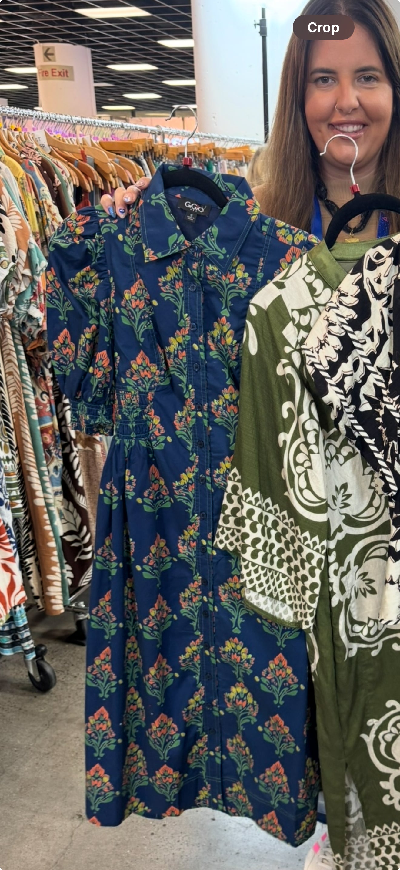 Floral Print Puff Sleeve Midi Shirt Dress with a Smocked Waist and Seaming Details.
