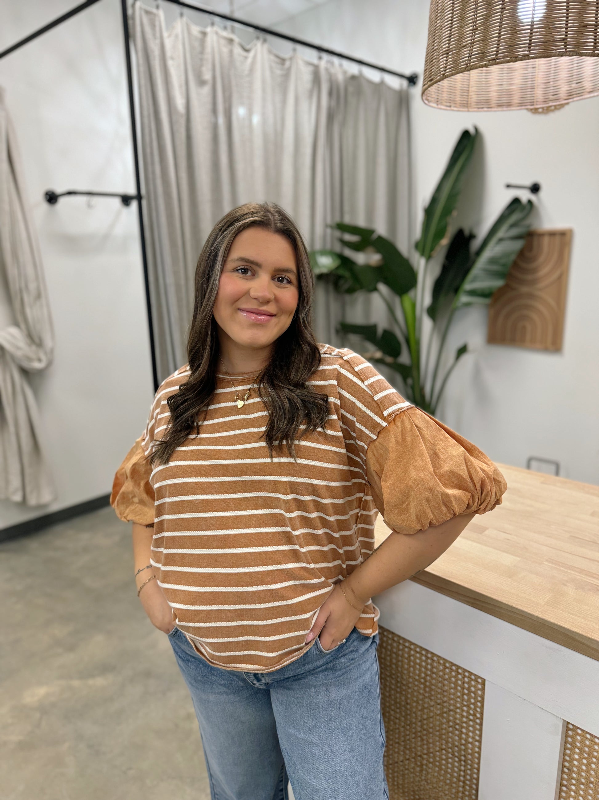 This textured striped top features a washed finish, a rounded neckline, contrast puff sleeves with pleated accents and gathered cuffs, and a relaxed silhouette for a softly structured, vintage inspired look. Fabric Contents