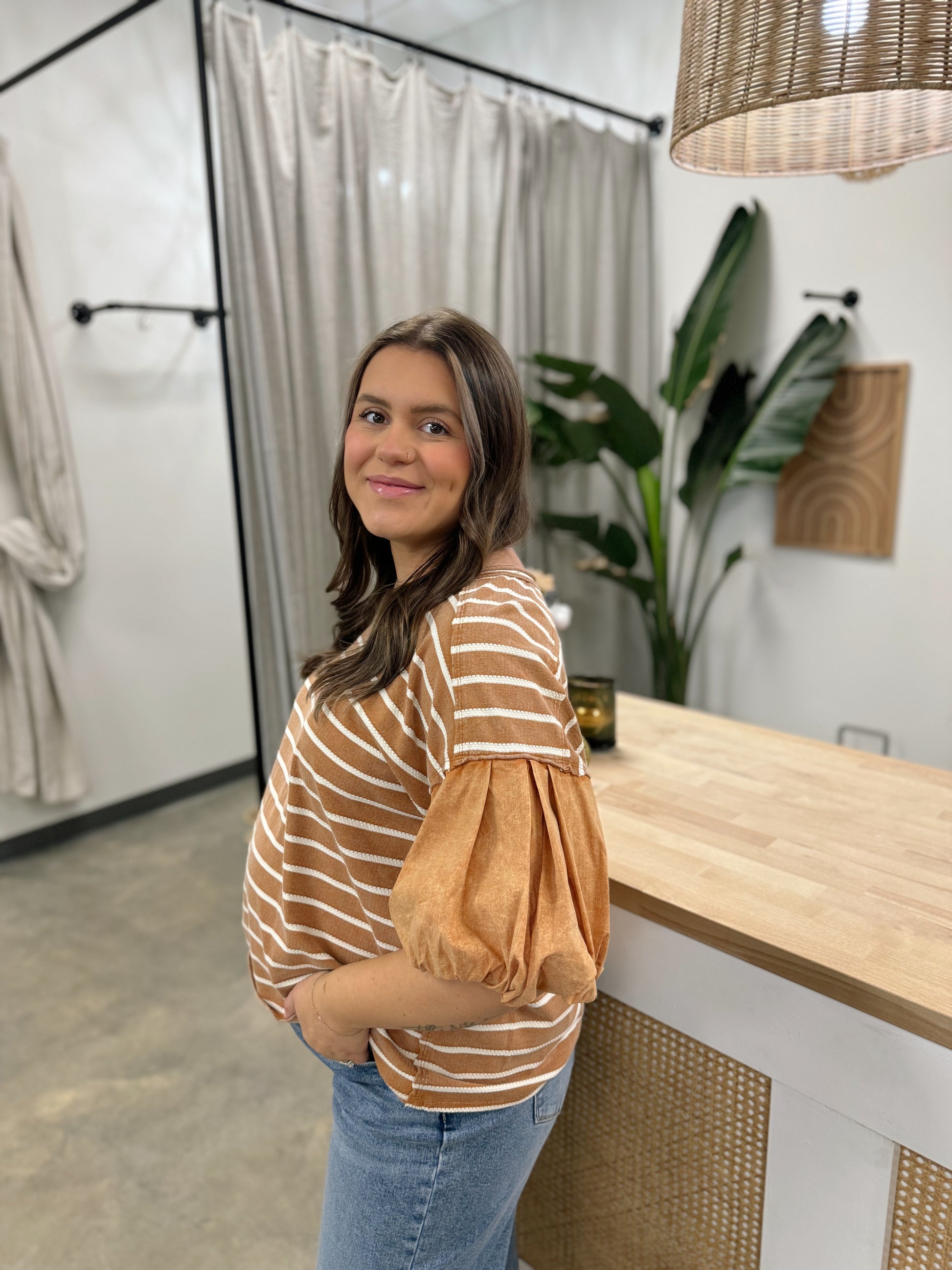 This textured striped top features a washed finish, a rounded neckline, contrast puff sleeves with pleated accents and gathered cuffs, and a relaxed silhouette for a softly structured, vintage inspired look. Fabric Contents