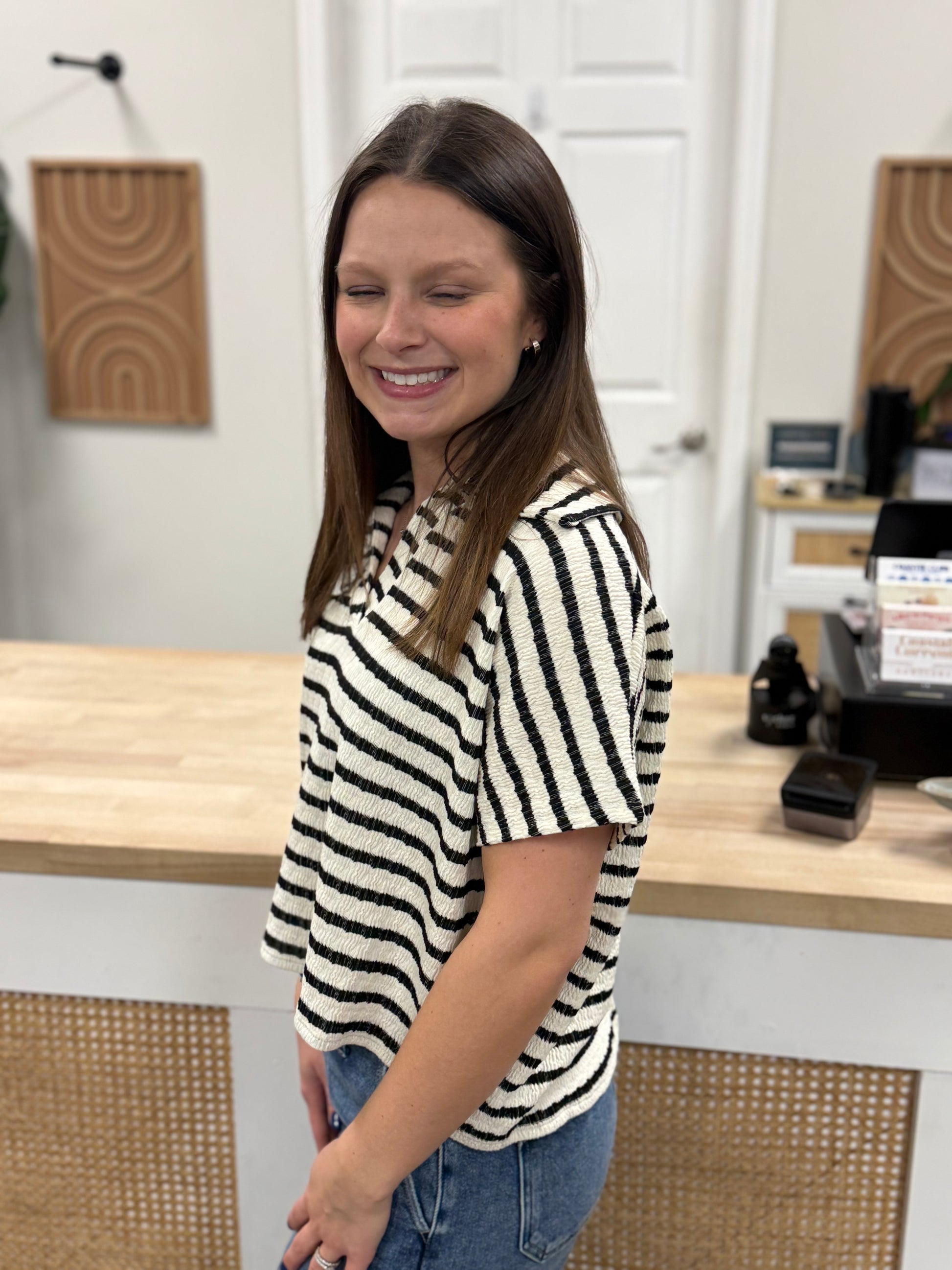 STRIPED SPLIT NECK COLLARED TOP TOTAL BODY LENGTH: 19.5", BUST: 50" approx. - MEASURED FROM SMALL Fabric Contents