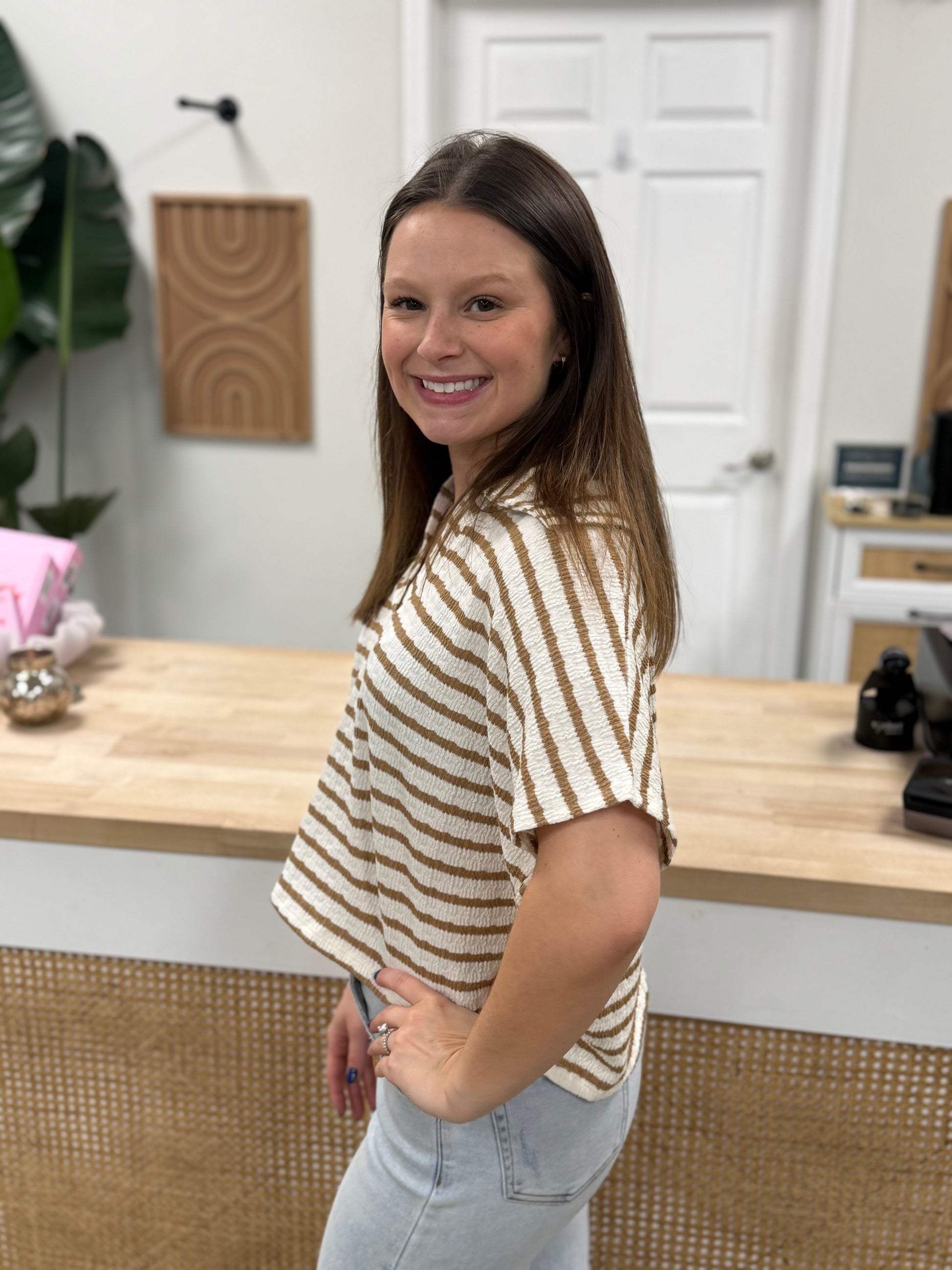 STRIPED SPLIT NECK COLLARED TOP TOTAL BODY LENGTH: 19.5", BUST: 50" approx. - MEASURED FROM SMALL Fabric Contents