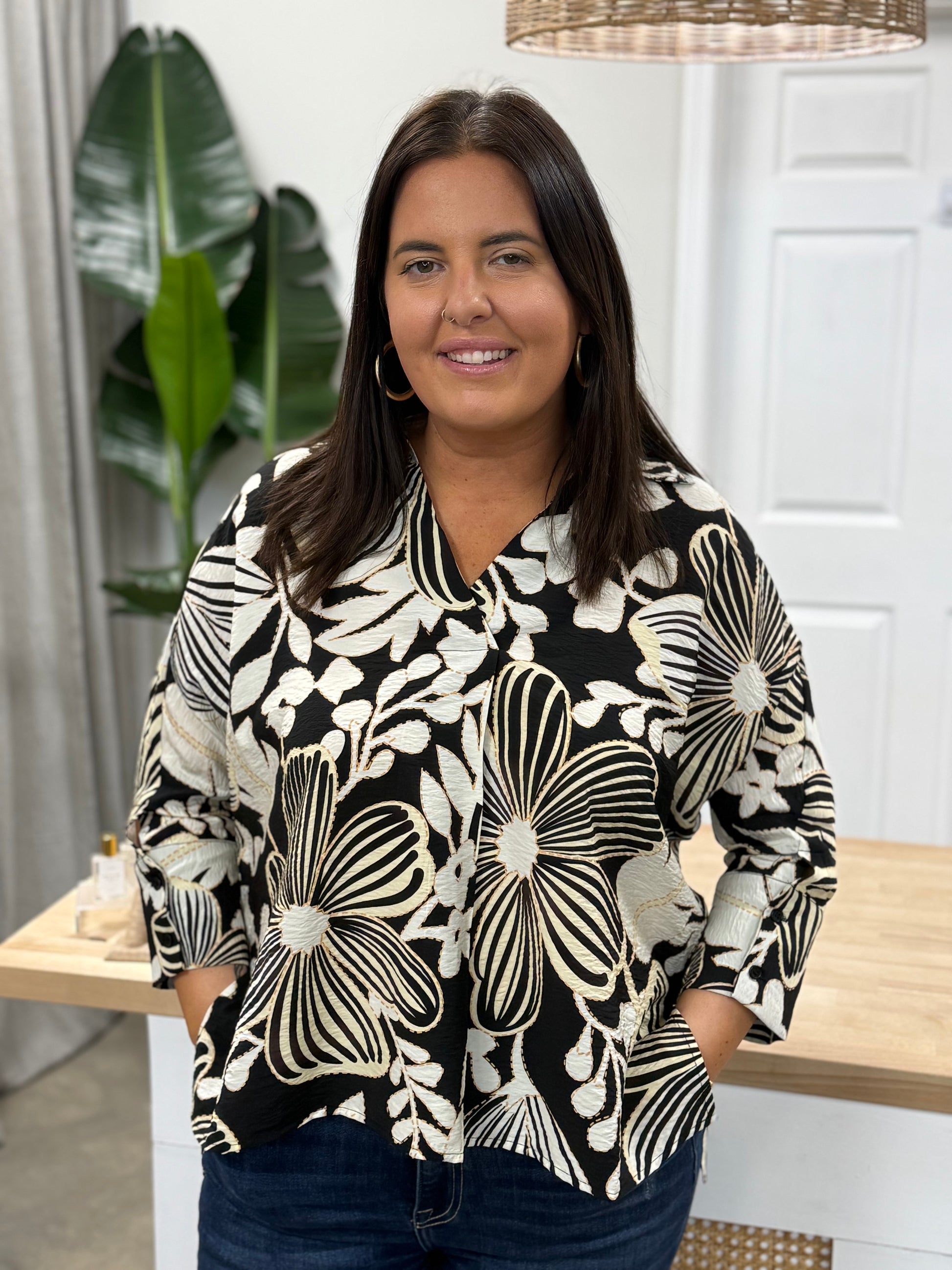 Drop shoulder big floral print top with front pleat detail, collared neckline, buttons on wrist cuffs, side slit, hi-low hem.