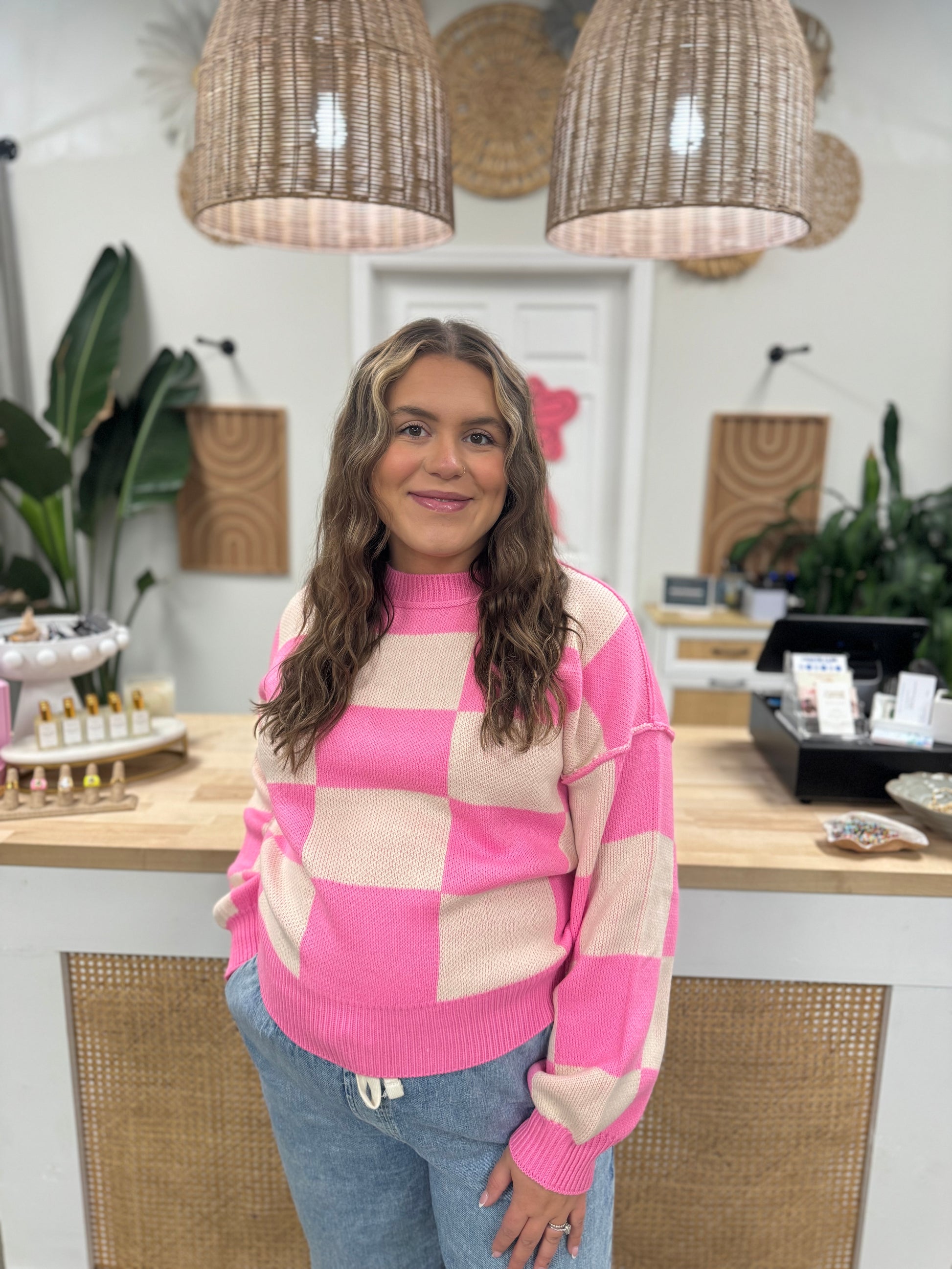 Elevate your wardrobe with this stylish sweater featuring a bold, checkered pattern for a pop of texture. Perfect for a casual outing or cozy indoor moments, its crew neck and relaxed fit ensure comfort all day long. Ideal for layering over a lightweight top or under a chic jacket as seasons shift.