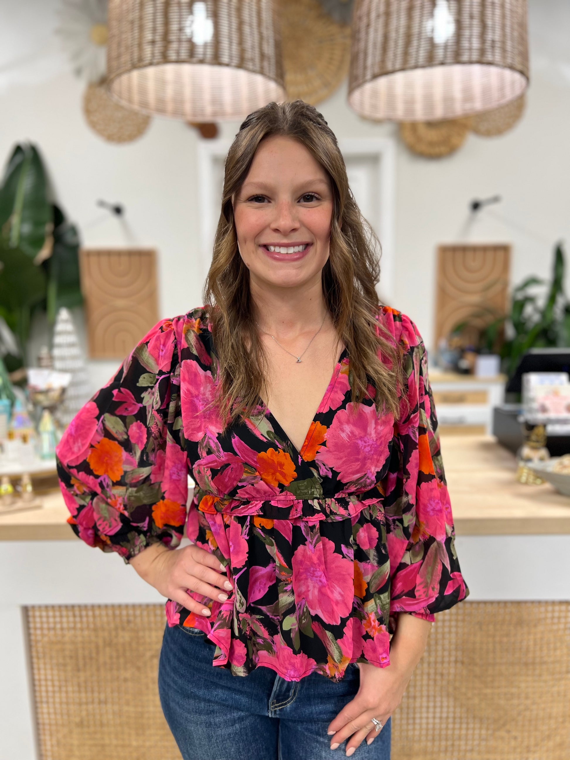 V NECKLINE - LONG SLEEVES - RUFFLE DETAIL - FLORAL - ELASTICIZED - LINED